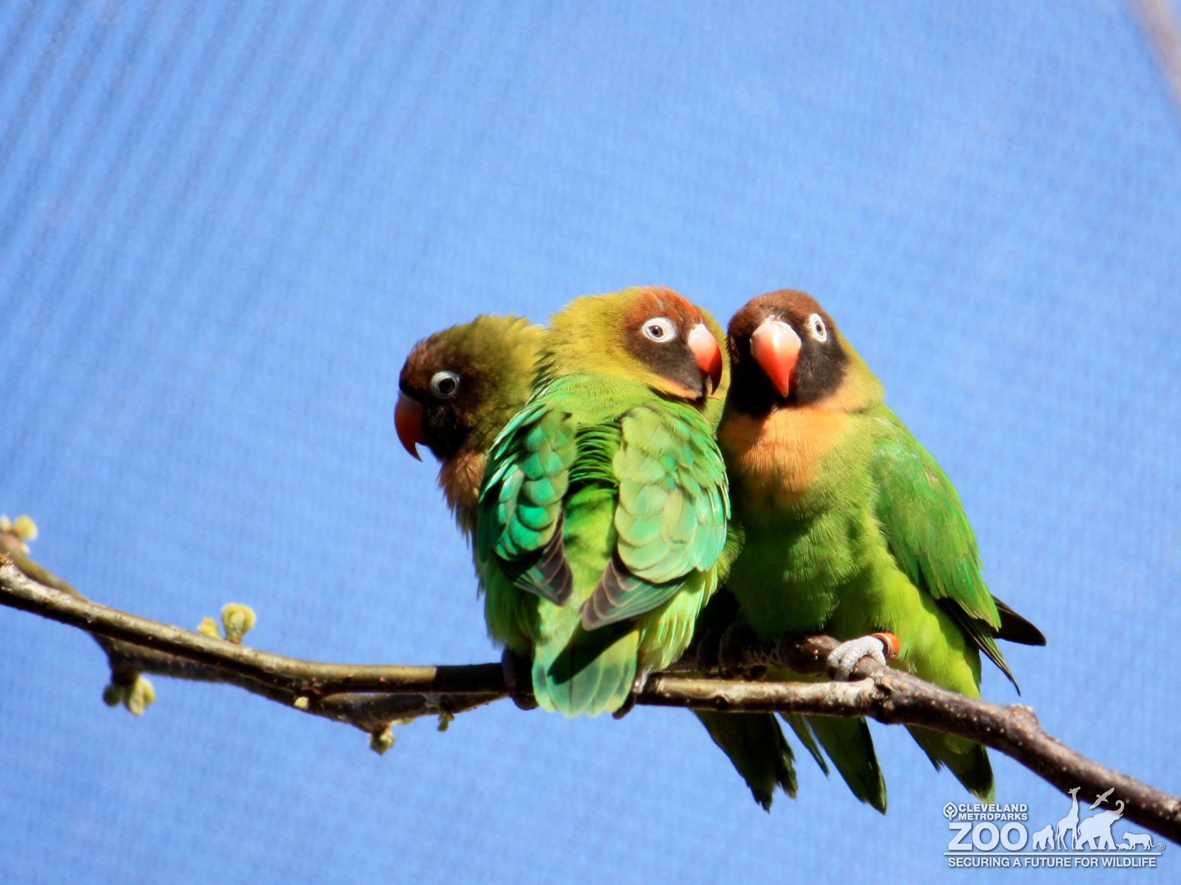 Three black-cheeked lovebirds perched on a thin branch. Background is a bright blue sky. Birds have their green feathers fluffed out. They have black feathers on the face area. Bright red beak.
