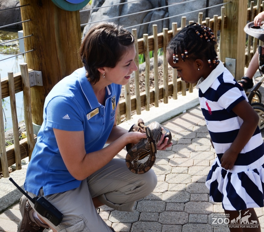 Interpreter, Angie Reynolds, showing a young African American girl a snake. She is kneeling in front of the small child.