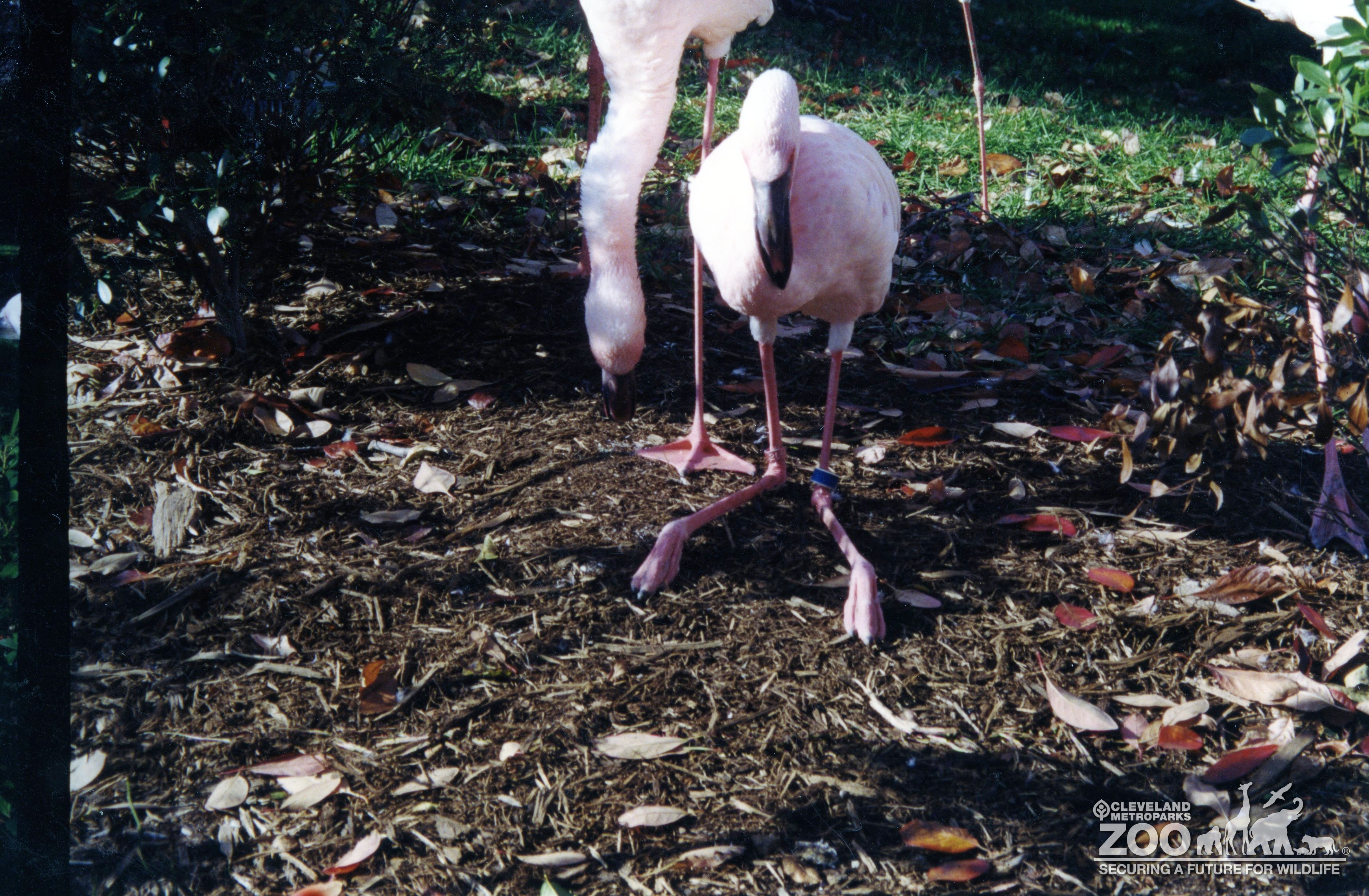 Chilean flamingo in shades of pink with head and black beak turned down and the neck and head of a second flamingo behind the first with beak lowered to ground. Chilean flamingo in focus with legs half bend along the brown mulch on ground scattered with leaves.