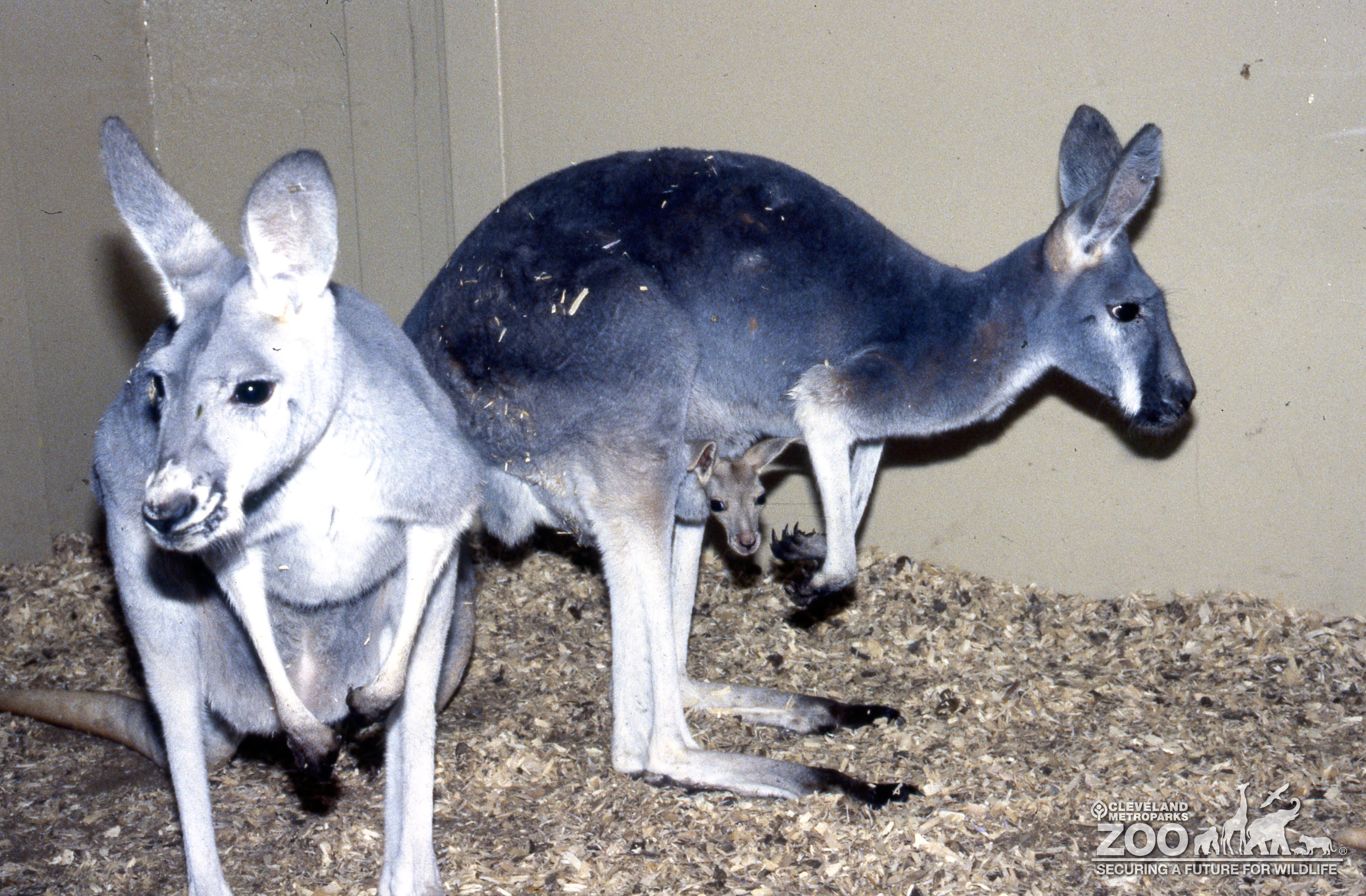 Pair of red kangaroos with a joey sticking its head out of the pouch. The three animals are in their barn.