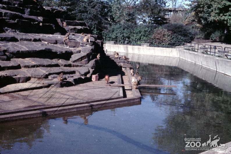 Monkey Island on left side, separated from visitor viewing area by a moat with the water reflecting trees surrounding the habitat. Several monkeys are on the island and near the moat.