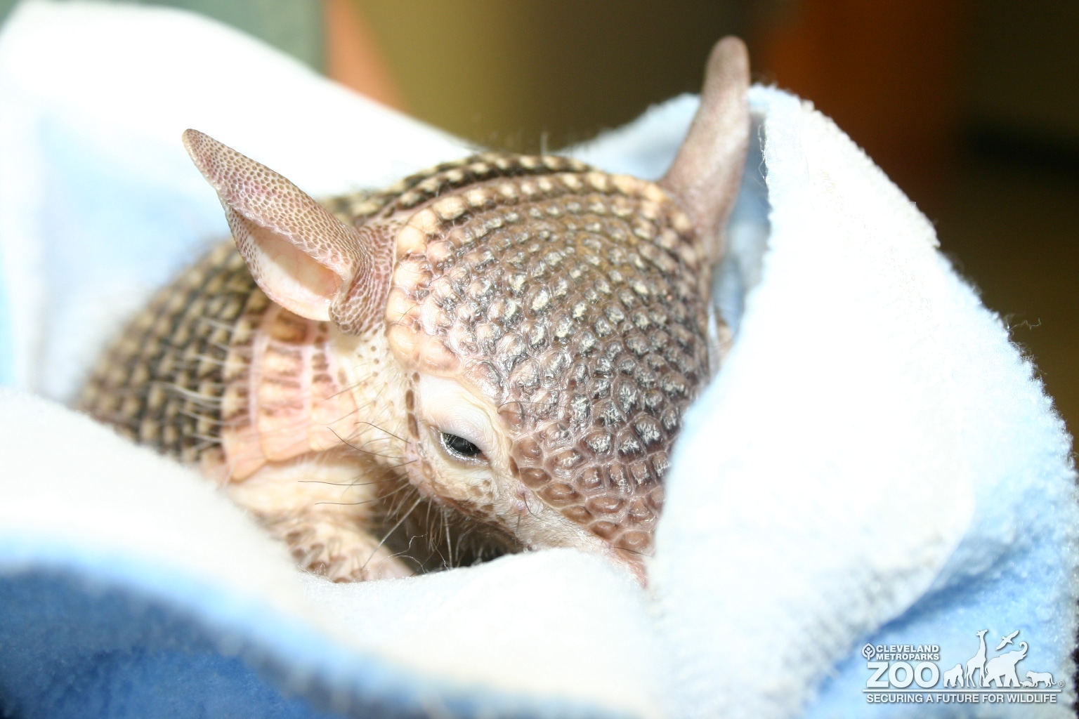 This baby Hairy Armadillo is curled up inside a blue blanket. The animal's head and back are covered in dark brown bumpy armor plates. It's head is partially covered by the blanket, so only the parts of the baby that are visible from behind the blanket are it's right eye, both ears and some of it's back.