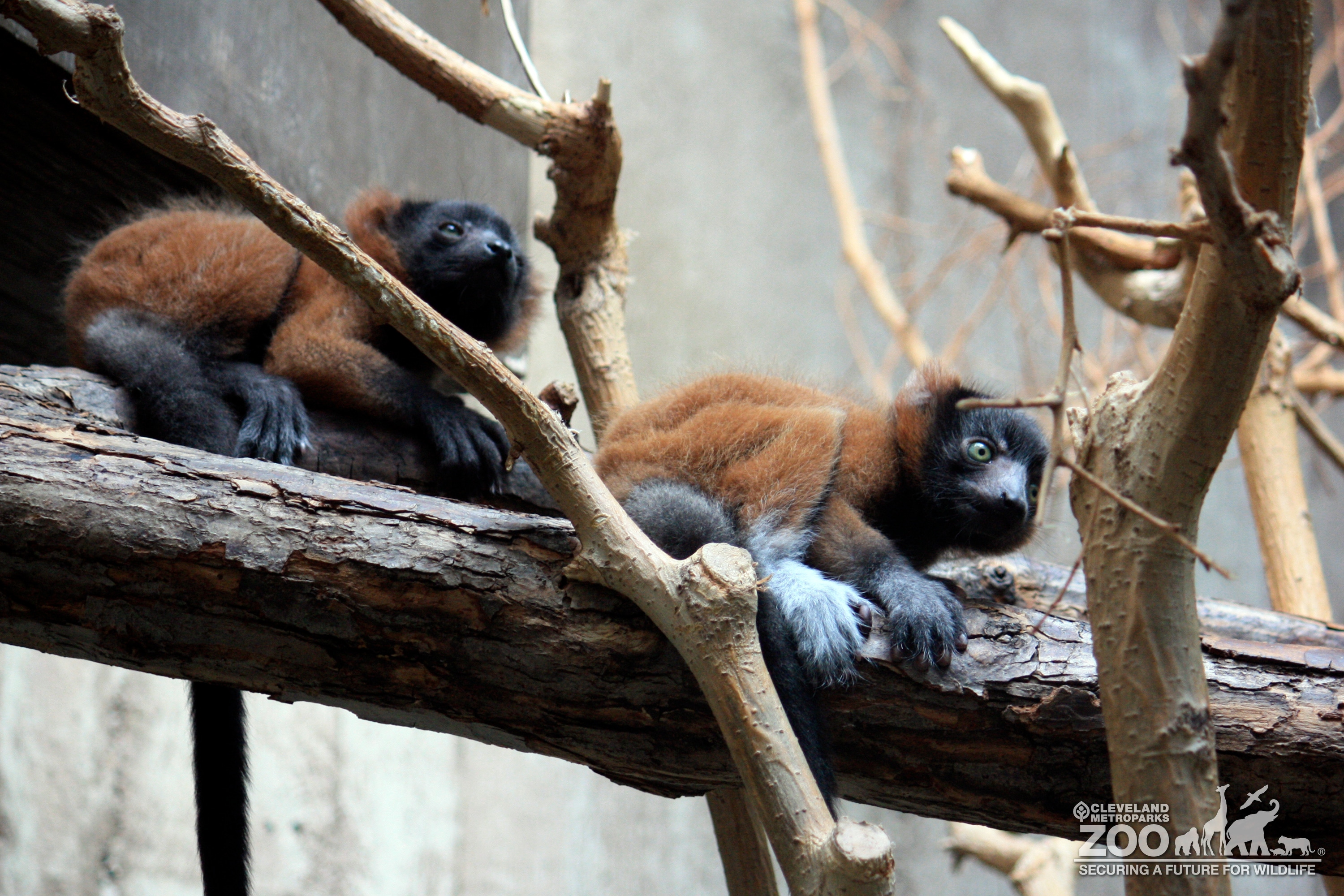 Pair of young red-ruffed lemurs on a log. Taken in the Primate, Cat & Aquatics building.