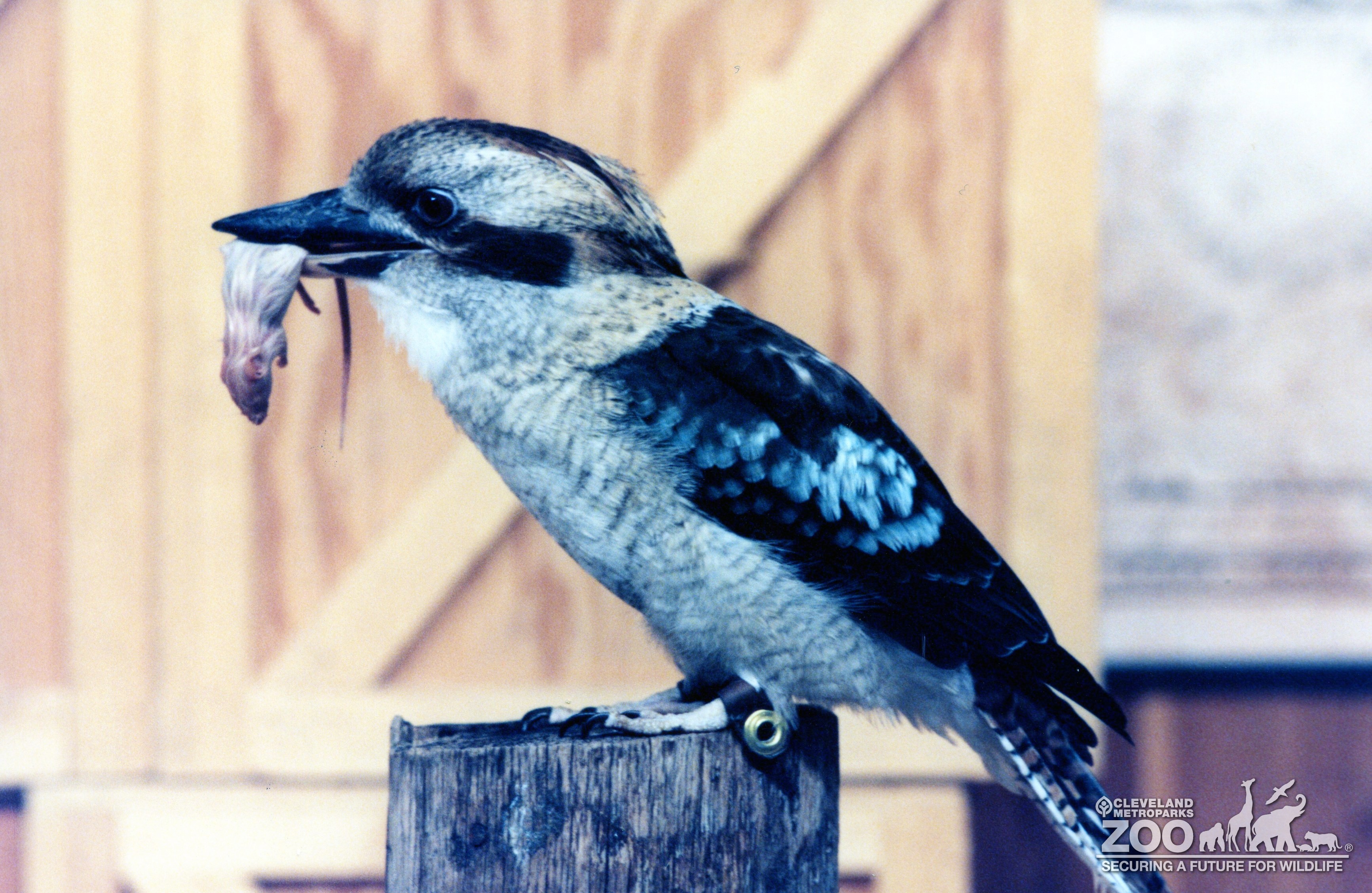 Kookaburra with a mouse hanging out of it mouth. Bird is seen in profile. It is perched on a small wood stump. Crates provide a background.