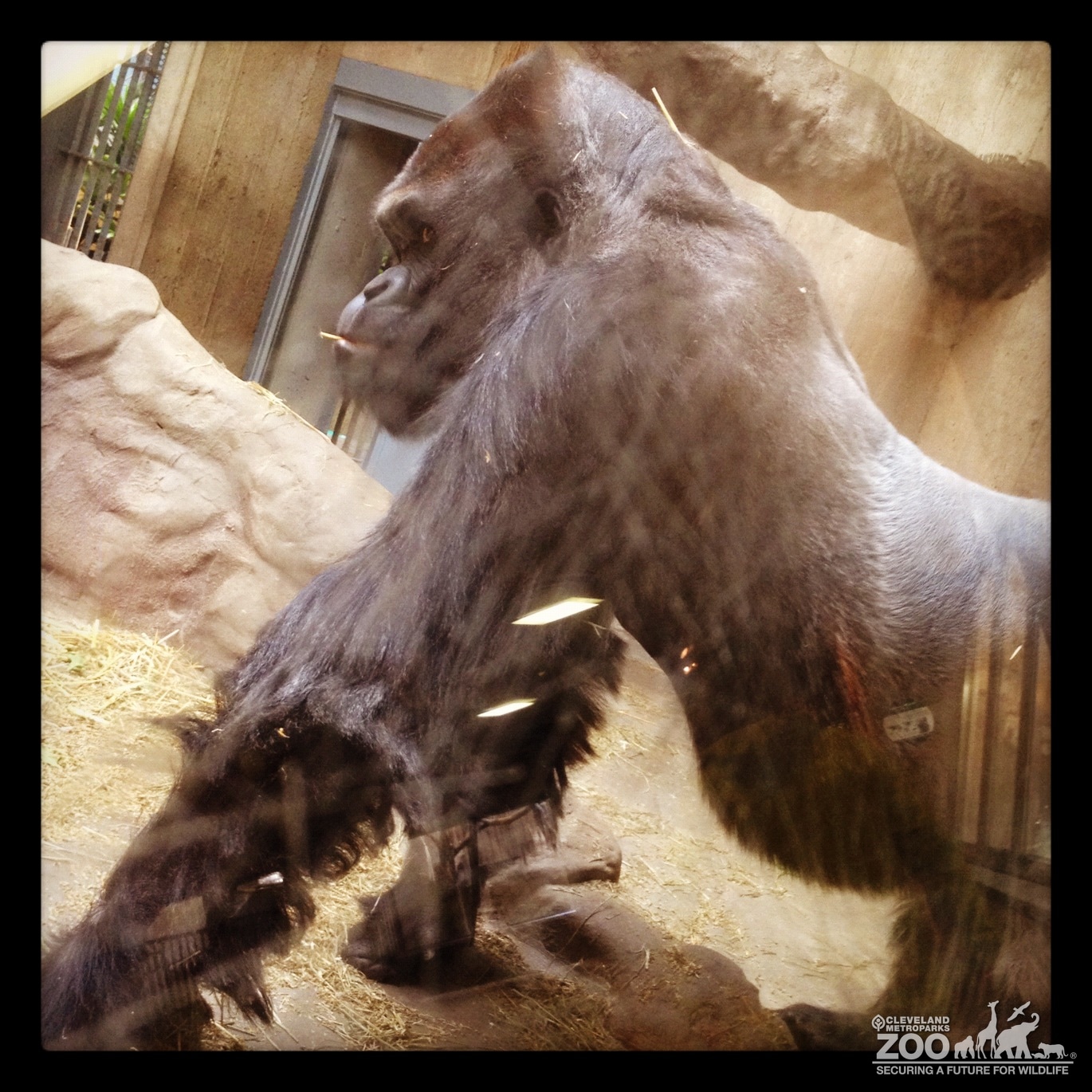 Gorilla viewed through the glass on the outside of Primate, Cat & Aquatics building. It is in a stance where all four limbs are on the ground and front knuckles bent inward.