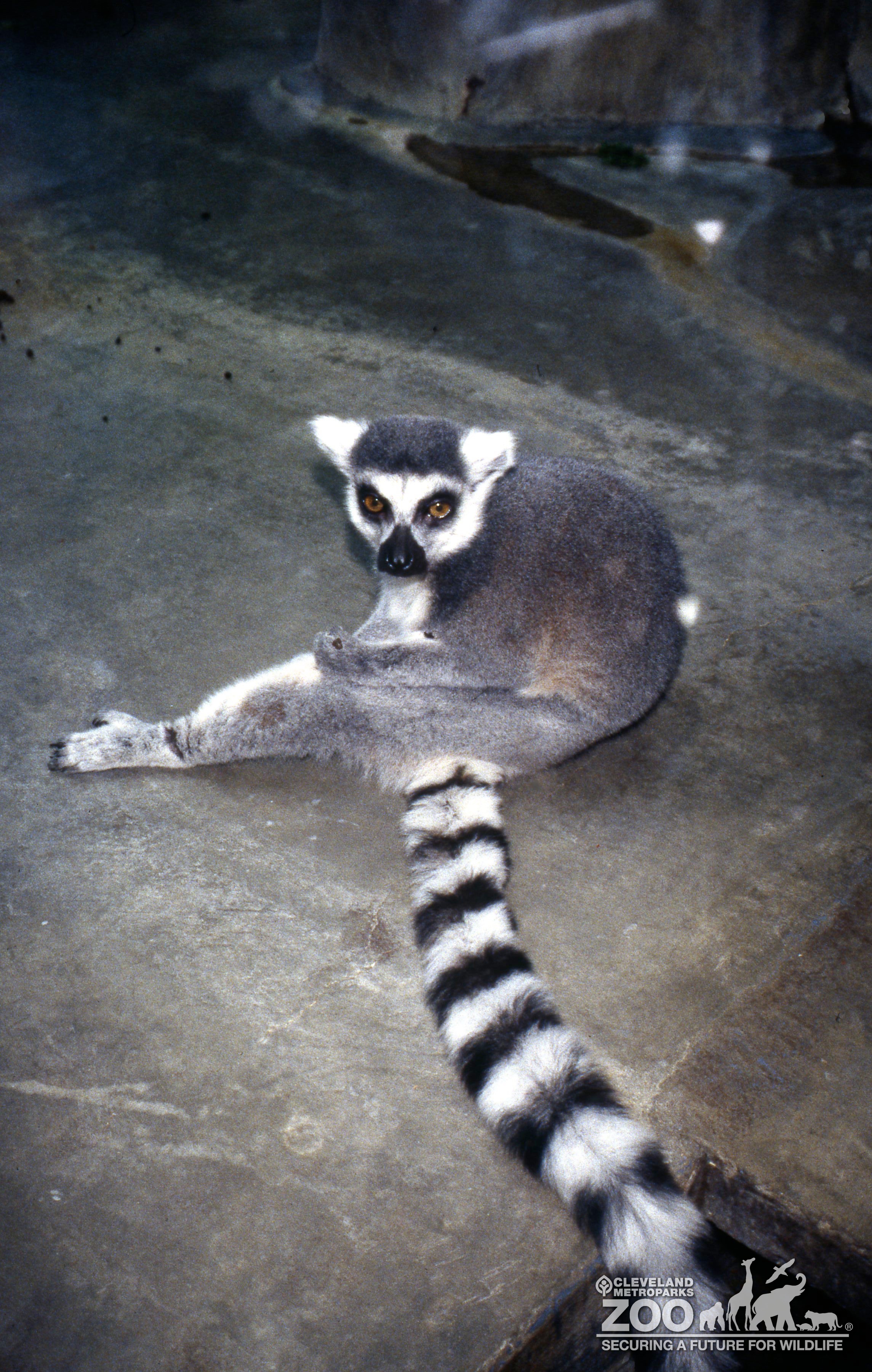 Ring-tailed lemur grooming itself while sitting on floor of habitat. Primates long black & white fur