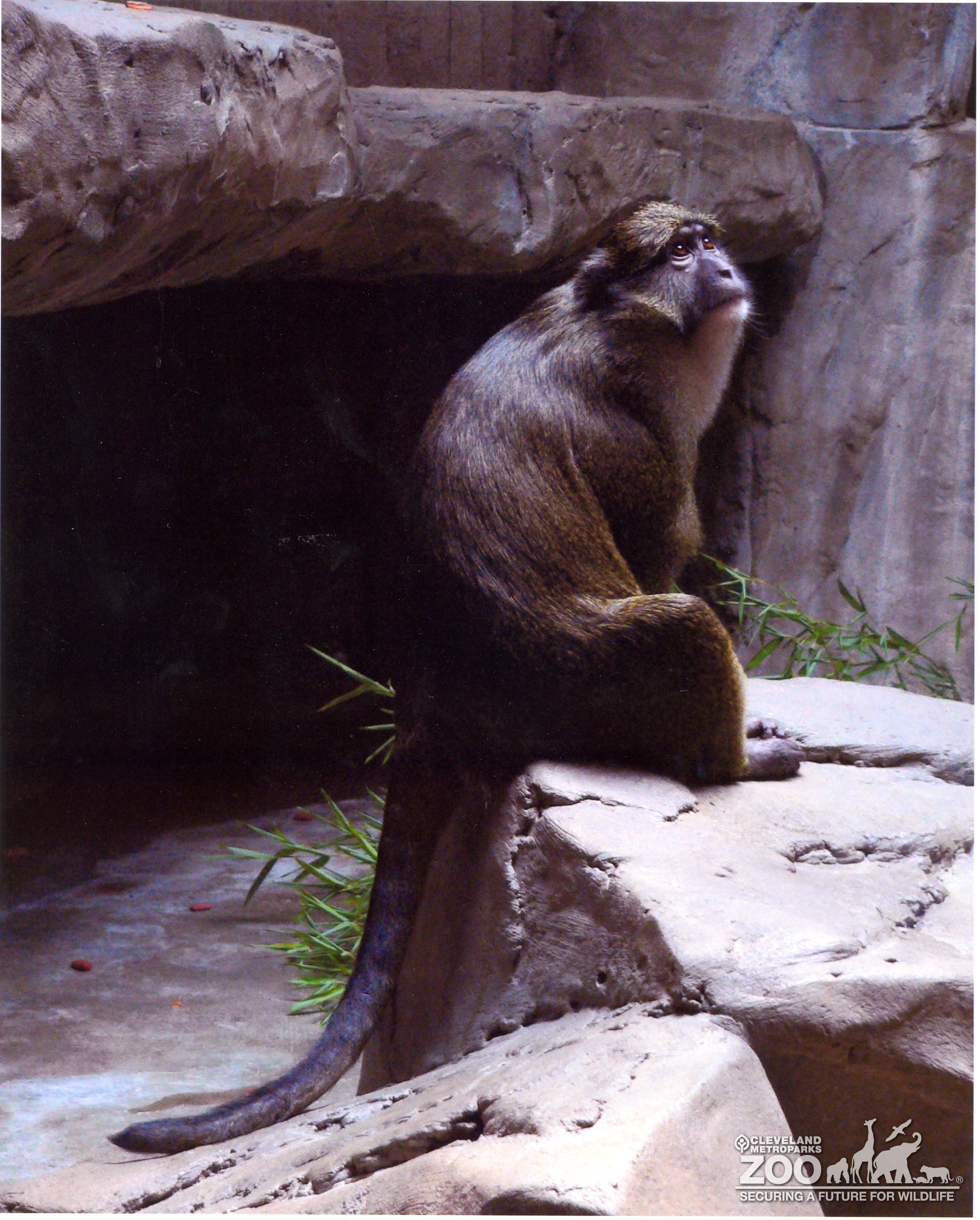 Allen's swamp monkey in exhibit looking up. Monkey is sitting on a exhibit rock. Primate is highlighted by light coming from above.