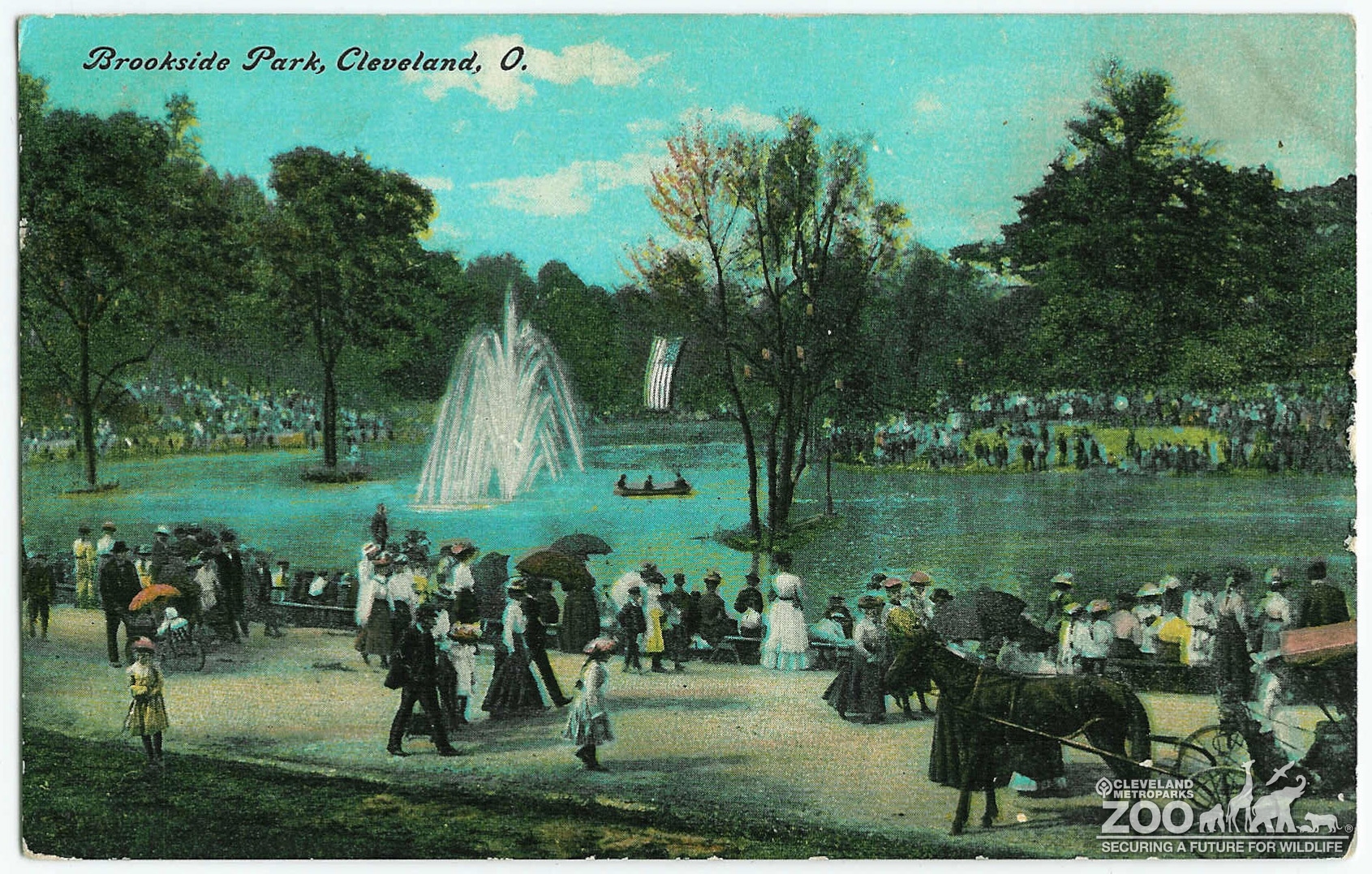This 1910 postcard reads Brookside Park, Cleveland, O. And shows people sitting and gathered around Waterfowl Lake. A fountain is also part of the lake. The photo has blue green tints depicting the age.