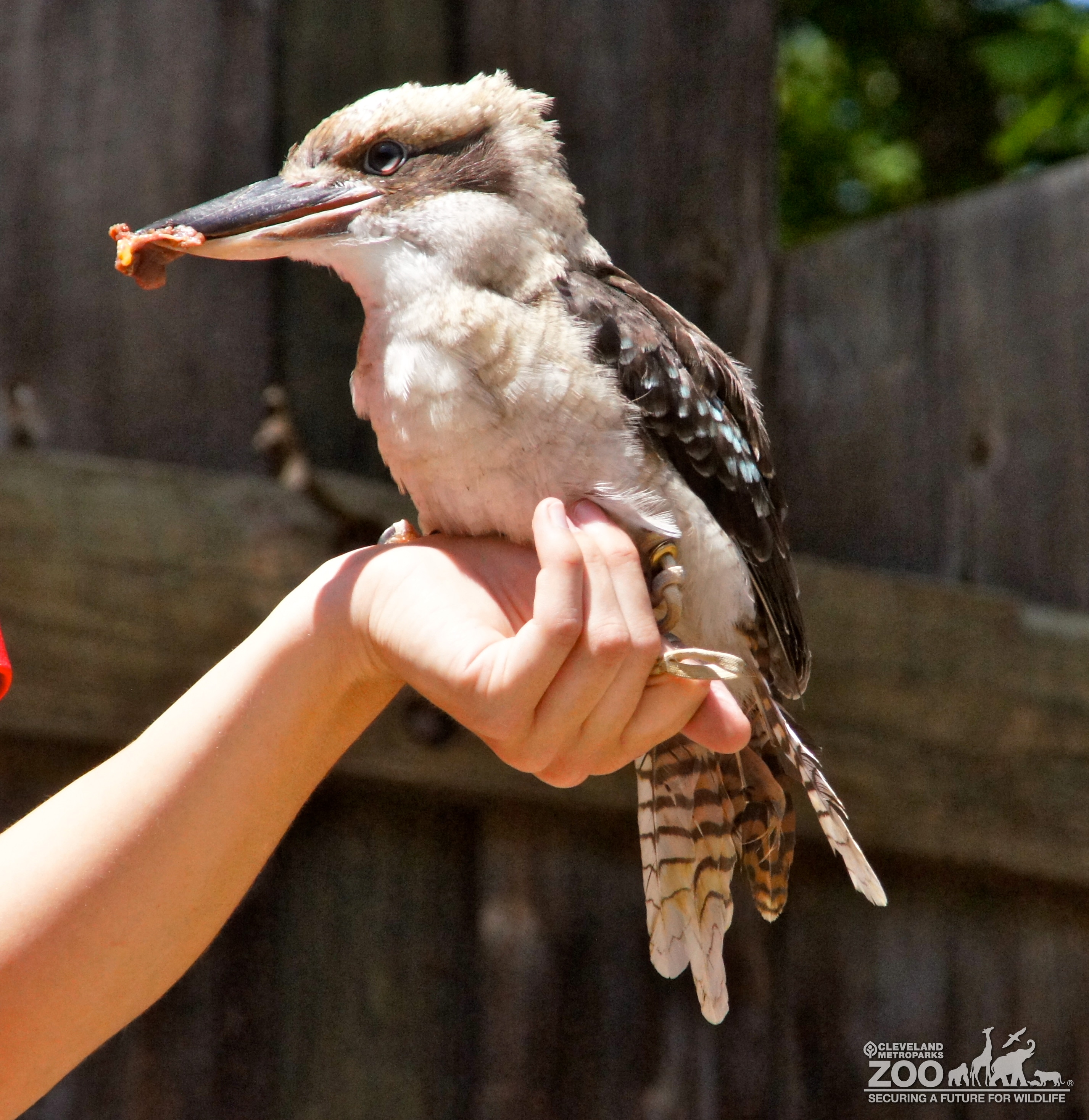 Kookaburra in profile facing left with a piece of food in beak and perched on handler's hand.