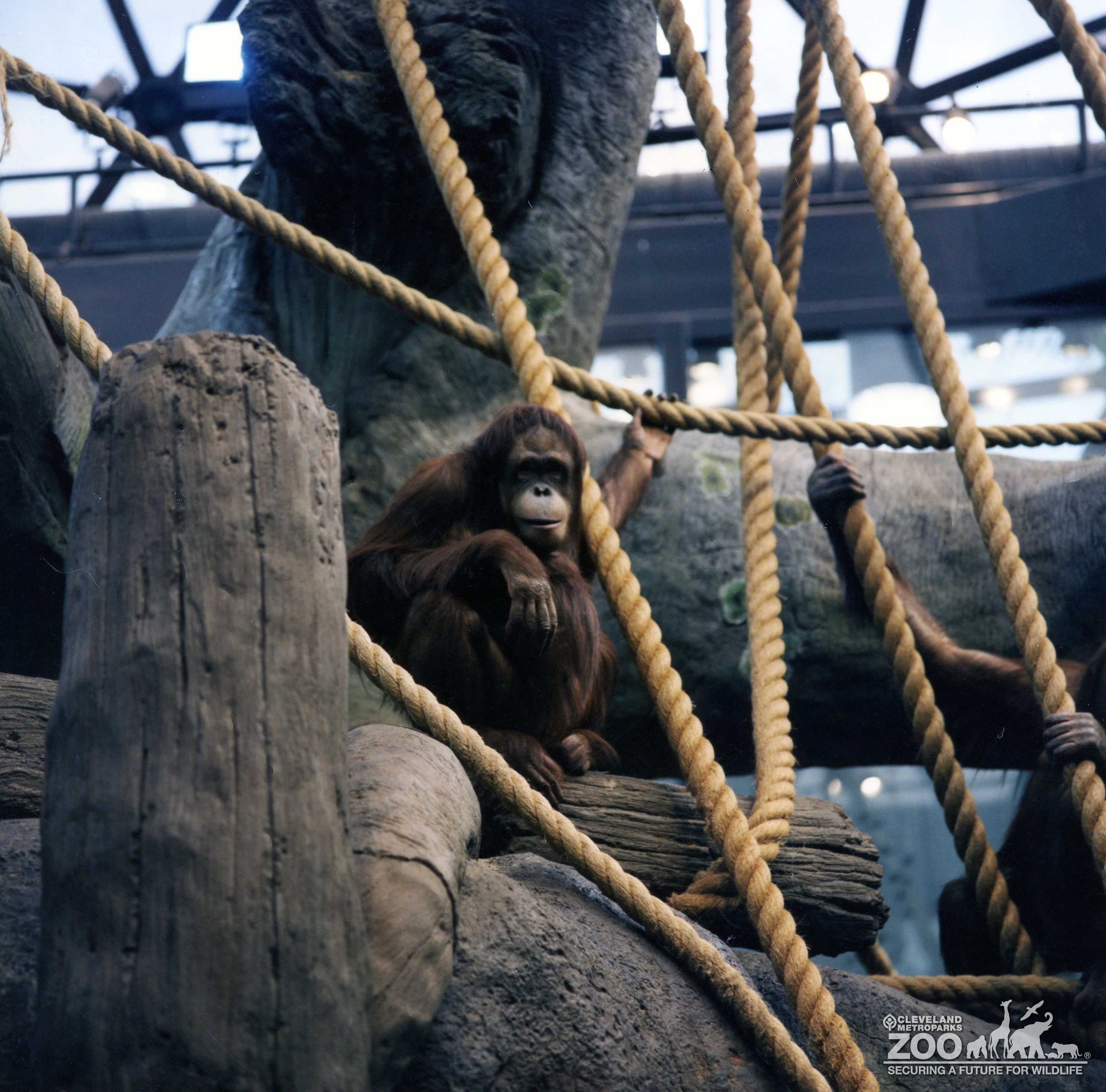 Orangutan high up in exhibit tree in The Rainforest. It is holding on to one of the large ropes.