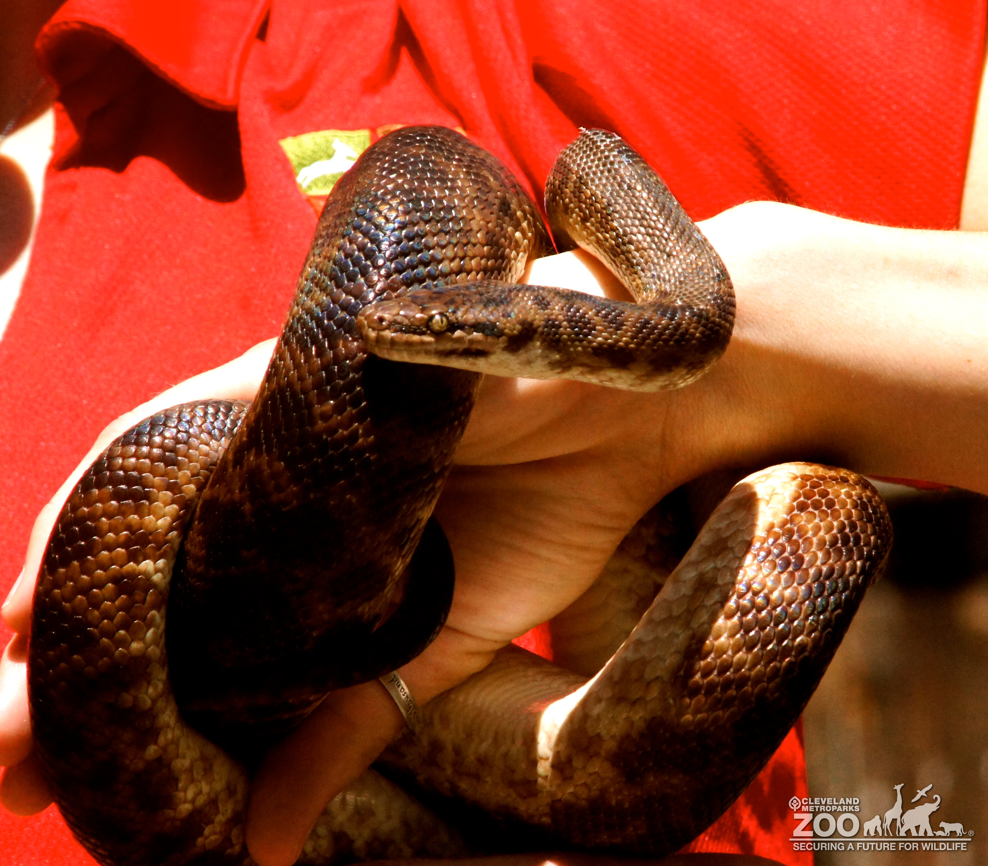 Children's python in shades of brown and black with head facing left coiling around a handler's hand and wrist