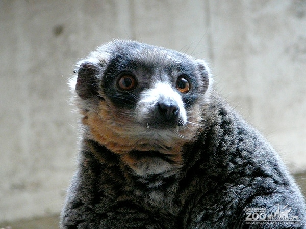 Mongoose lemur face fills the image. Its round eyes are looking to your right. Thick short fur covered it body.