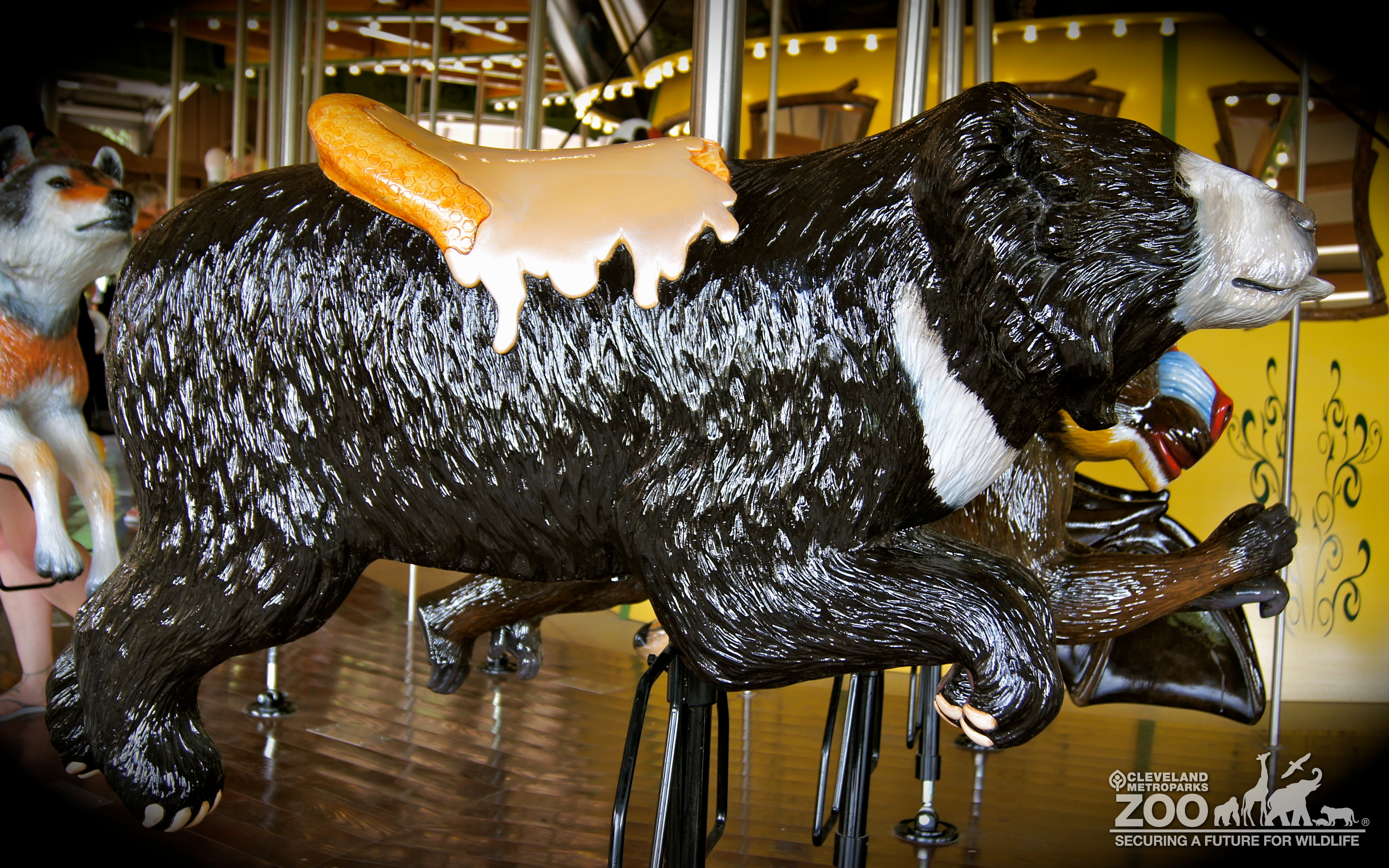 This is a photo of the right side of the Sloth Bear shaped seat on the Zoo's Circle of Wildlife Carousel. It is shaped to look as if it is running with it's front & back paws in the air. It has a small gold-colored saddle on its back that is designed to look as if light brown honey has been dripped on it to stick it to the bear's back. The bear is covered in short black fur with a white muzzle and a white stripe across its neck.