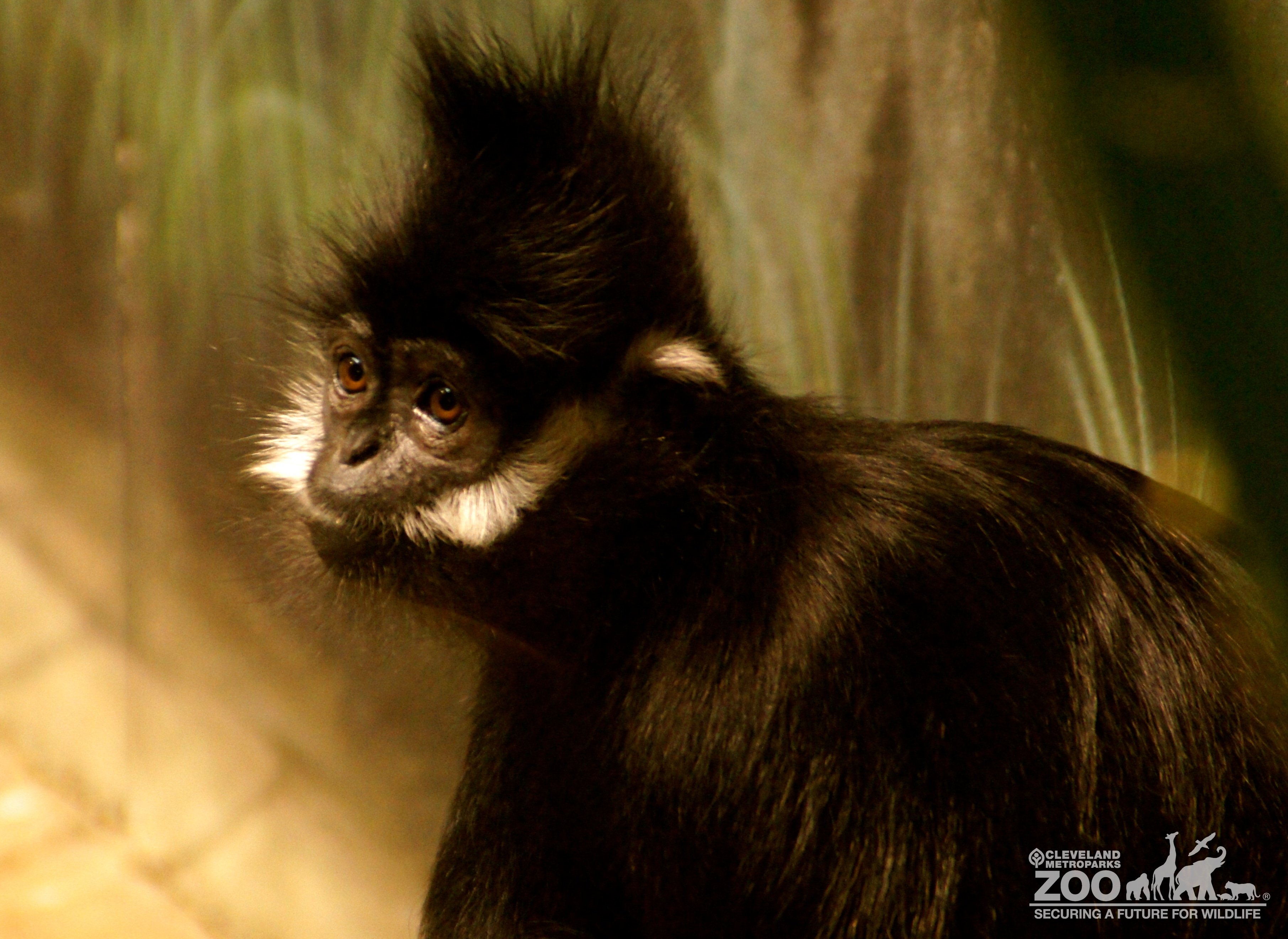 Francois langur sitting looking to your left. Primate has shiny black fur with white fur cheeks.
