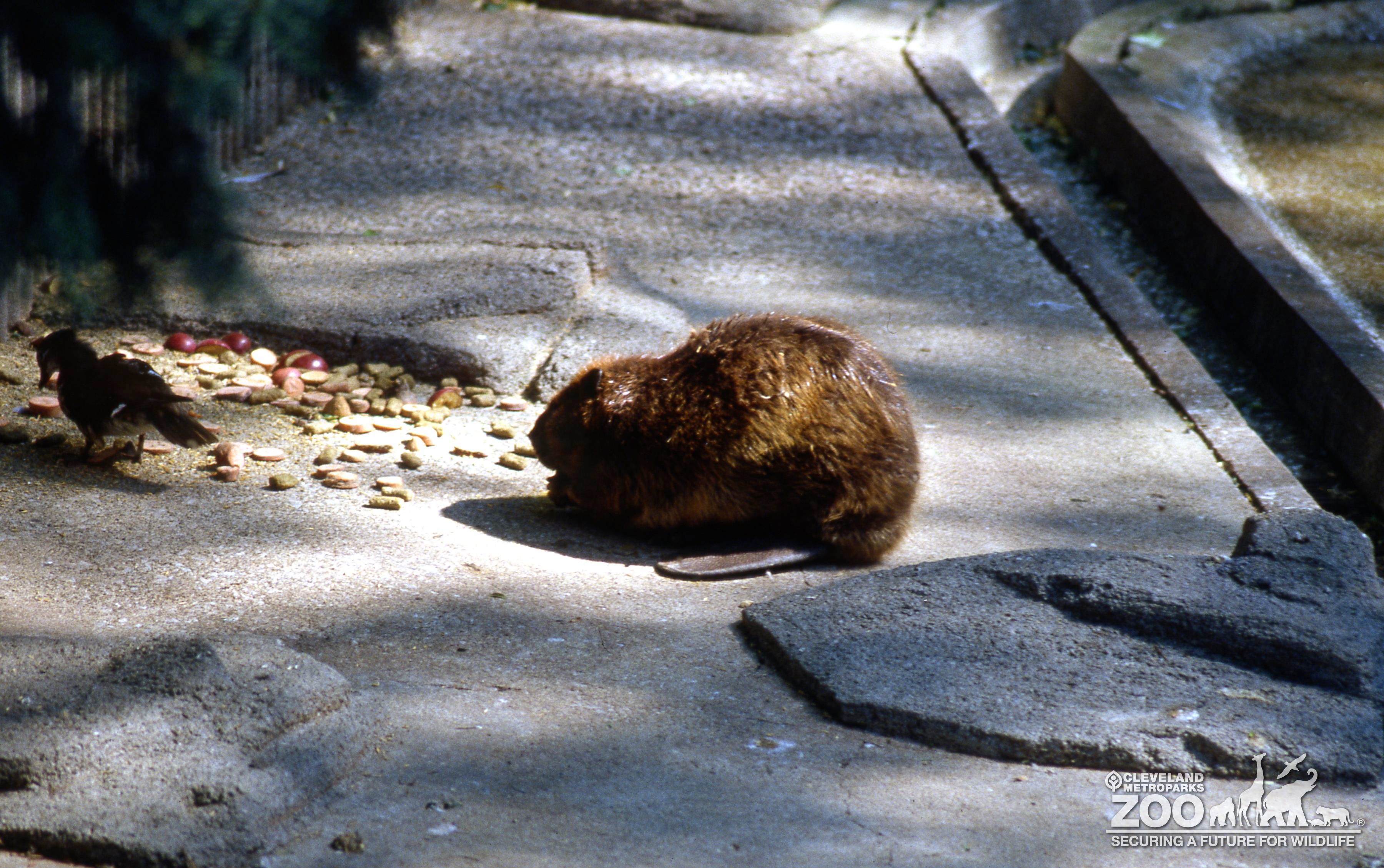 The beaver is sitting in the shade eating green apple slices. It looks similar to a rodent and is covered in reddish brown fur with flat black tail. In the background is the grey concrete floor of the beaver's outdoor enclosure, in front of the beaver are bunch of grapes and apple slices with a bird trying to steal some.