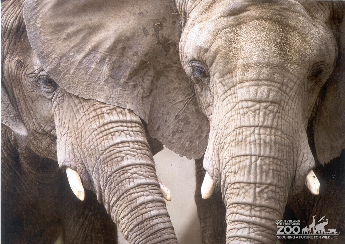 A pair of Elephants at the Old Pachyderm Building. The ear of one of the Elephant's is partly covering the face of the other Elephant.
