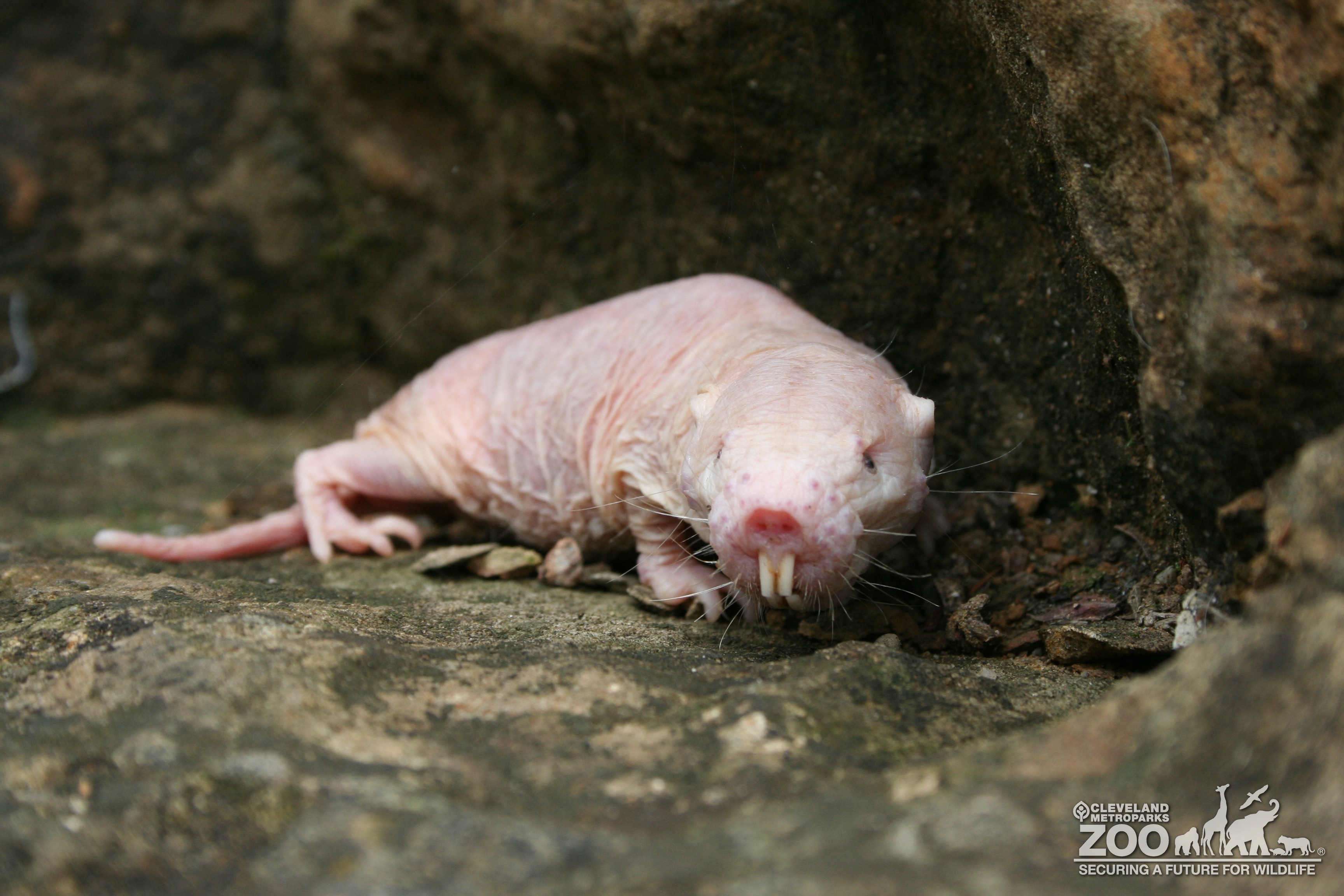 Naked mole-rat crawling in a rocky tunnel. This pink wrinkly hairless rodent lives underground in tunnels.