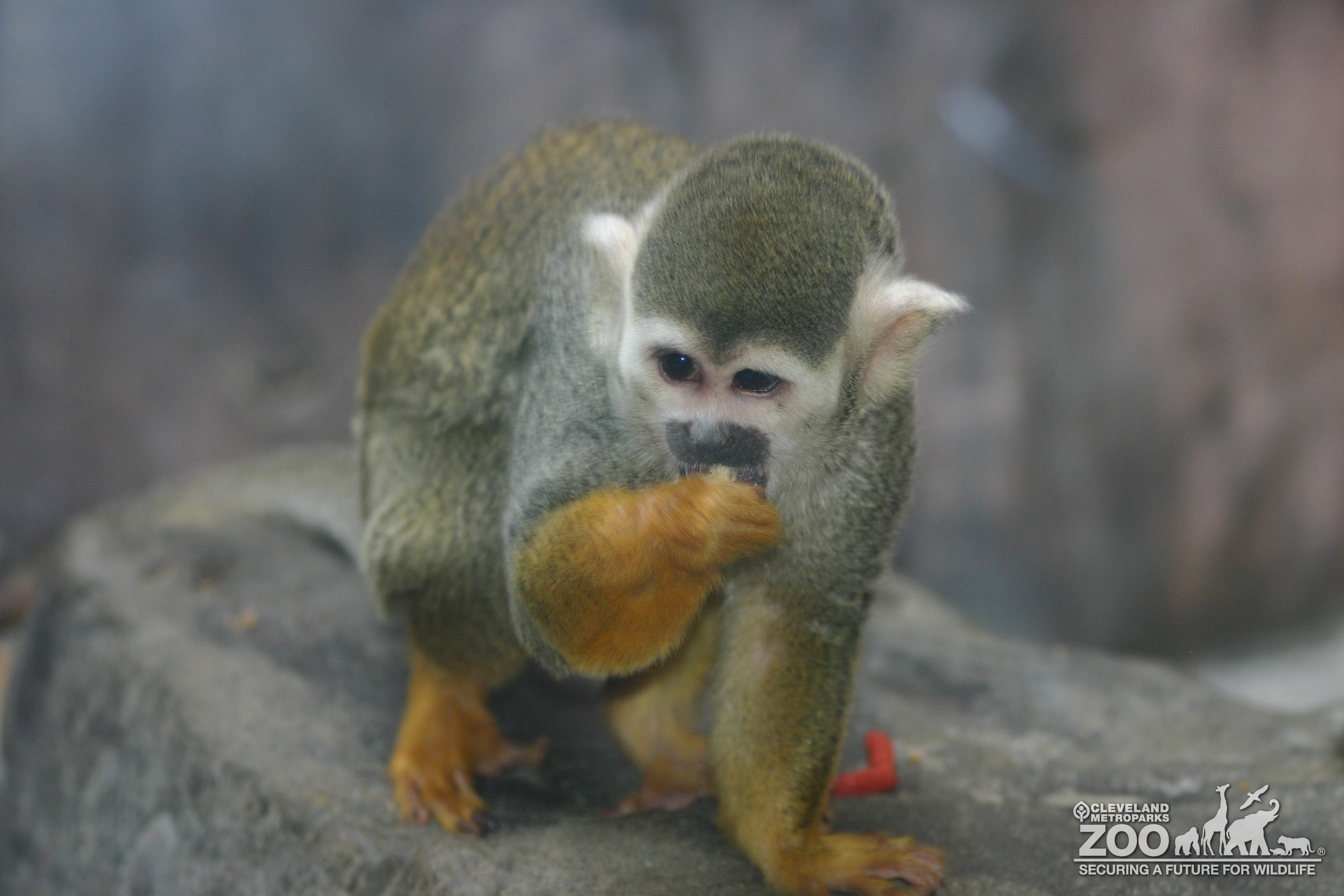 Common squirrel monkey eating some in it had. This small gray monkey is sitting on a rock in it exhibit. It has white markings on it face and ears.