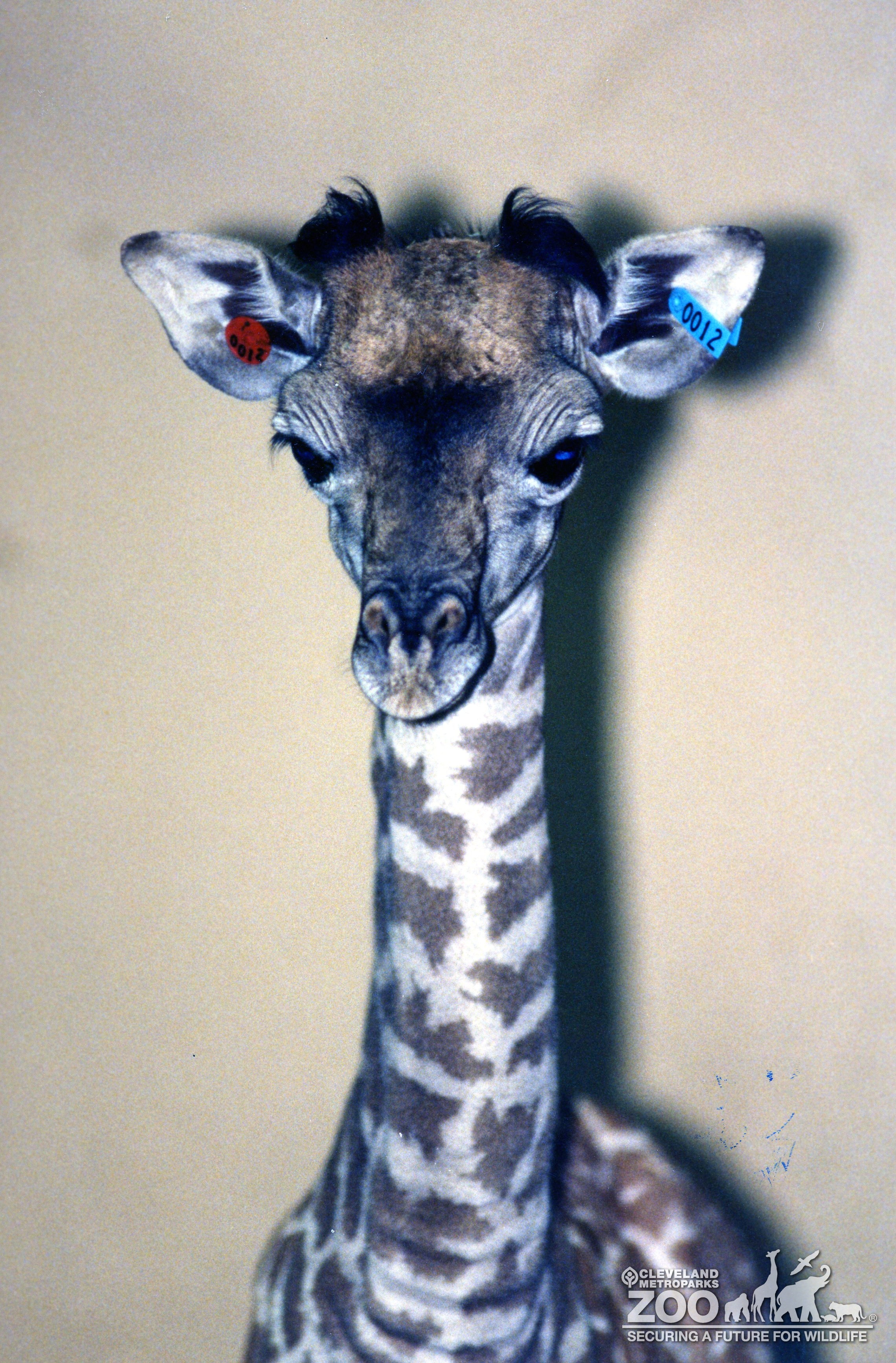 Masai giraffe infant head shot. Young giraffe is looking directly at the camera. Its large dark eyes and eyelashes of in focus. Each ear is tagged with identification. The tags are colored plastic that pierces the ear but causes no harm.