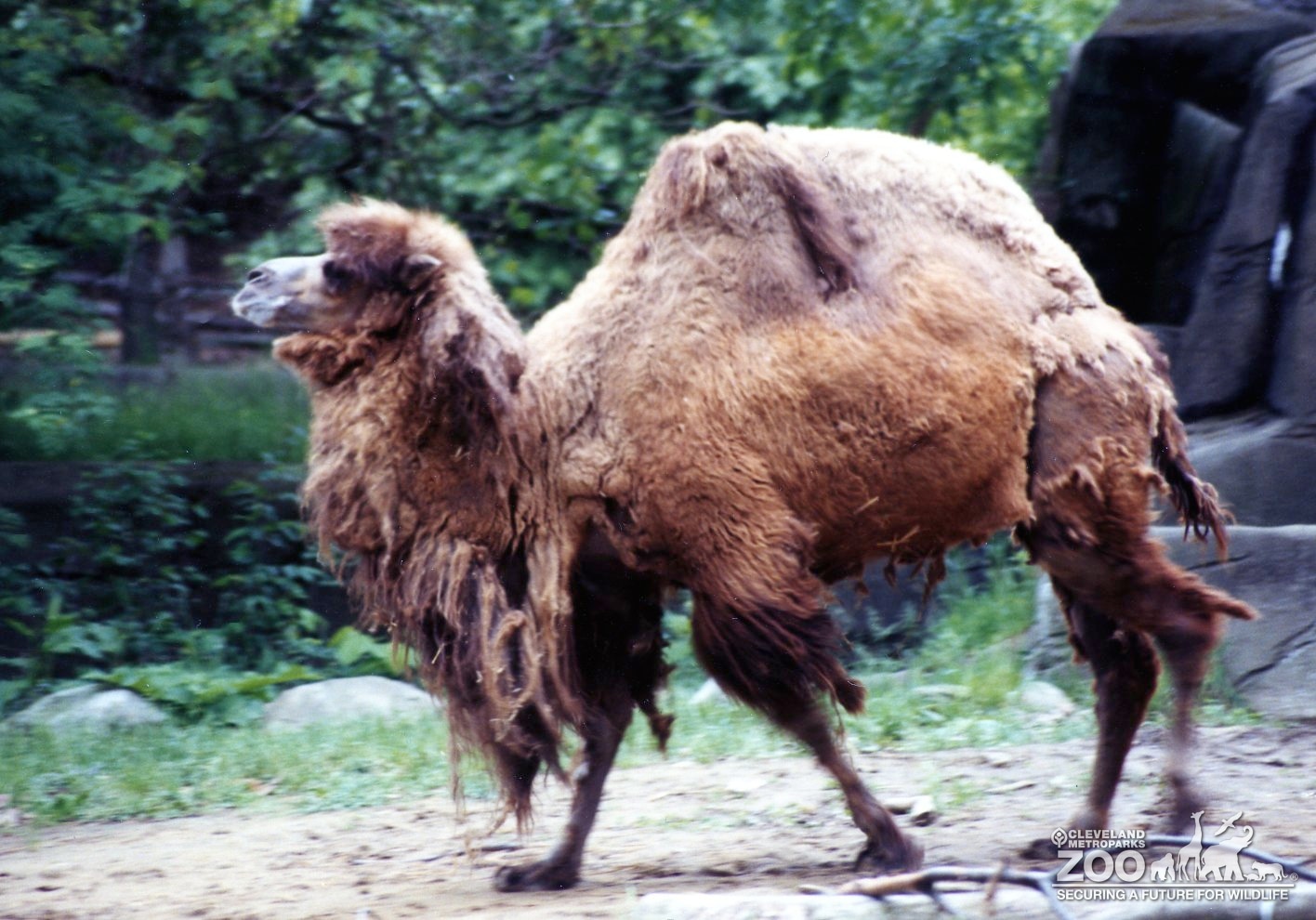 A photo of the left side of a Camel walking through on the green grassy terrain of its outdoor enclosure. It is covered in reddish brown fur with a large hump on its back. Around its head and down the front of its neck the camel has very long hair hanging down to it knees.