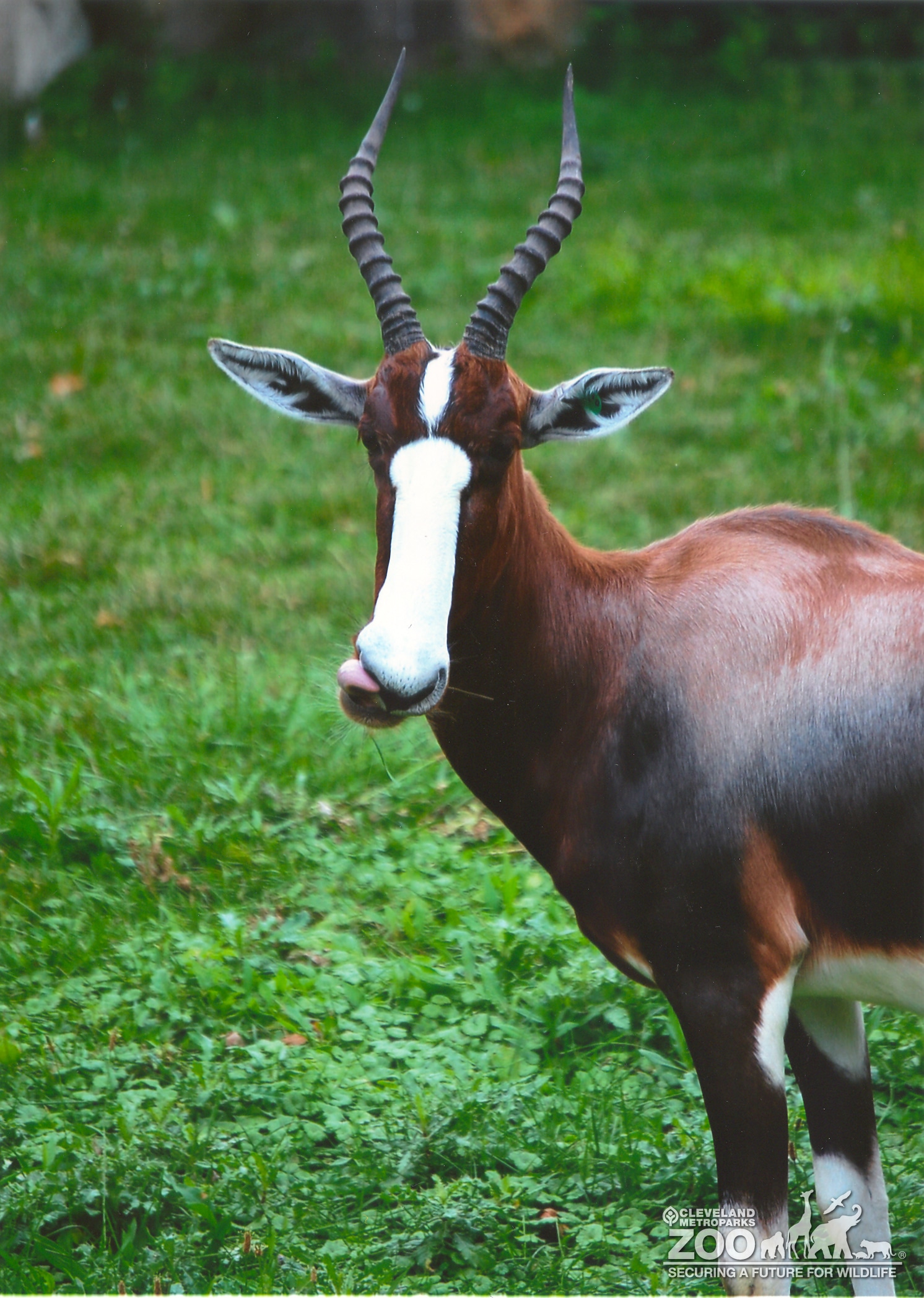 Focus on bontebok head facing camera with tongue sticking out to the left. Bontebok in shades of dark brown with wide white stripe down center of face and a smaller stripe in center of head going between dark brown and black antlers. Ears pointing to each side.