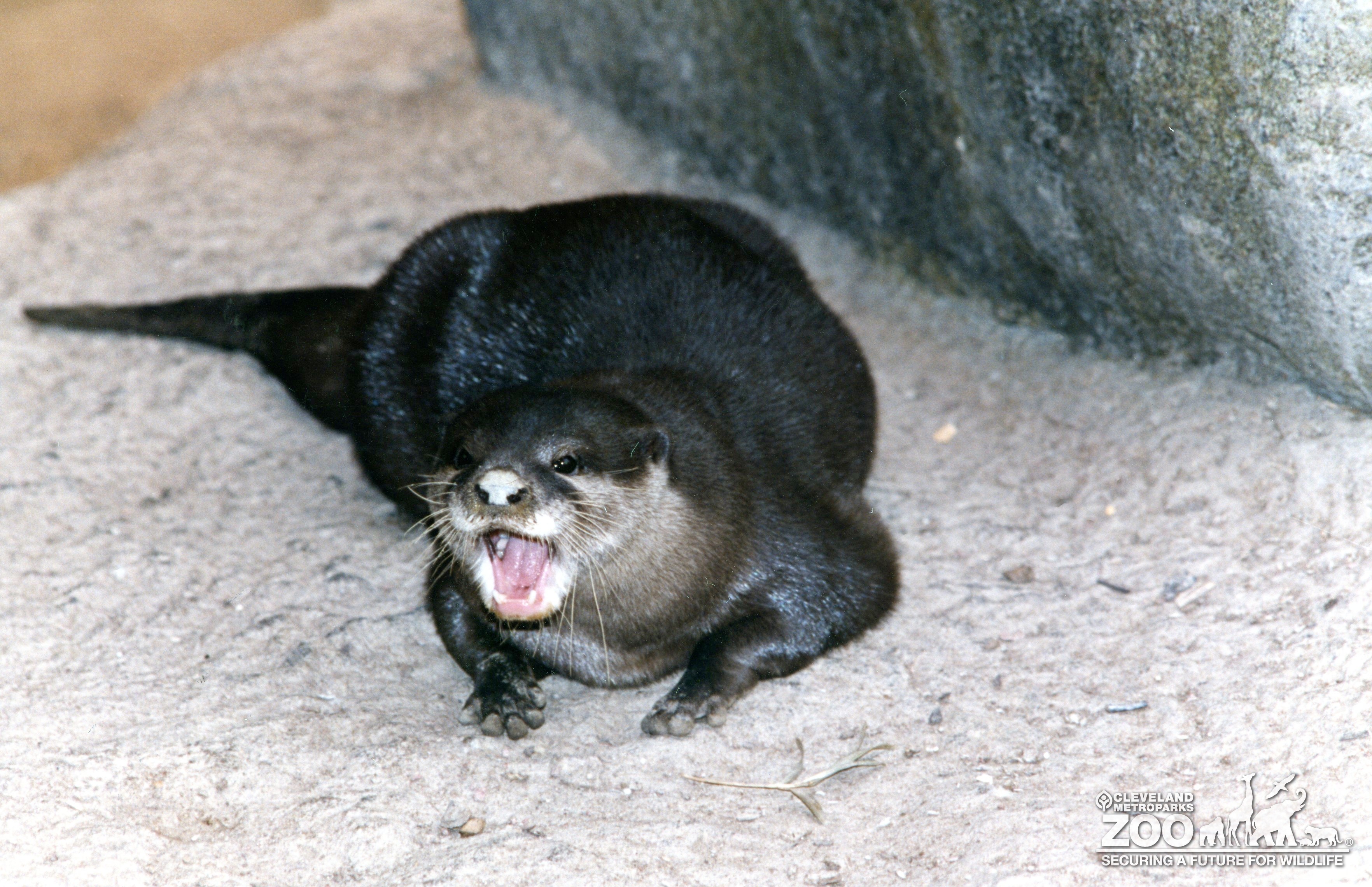 Otter on a rock showing its teeth with mouth open. Animal has sleek dark fur.