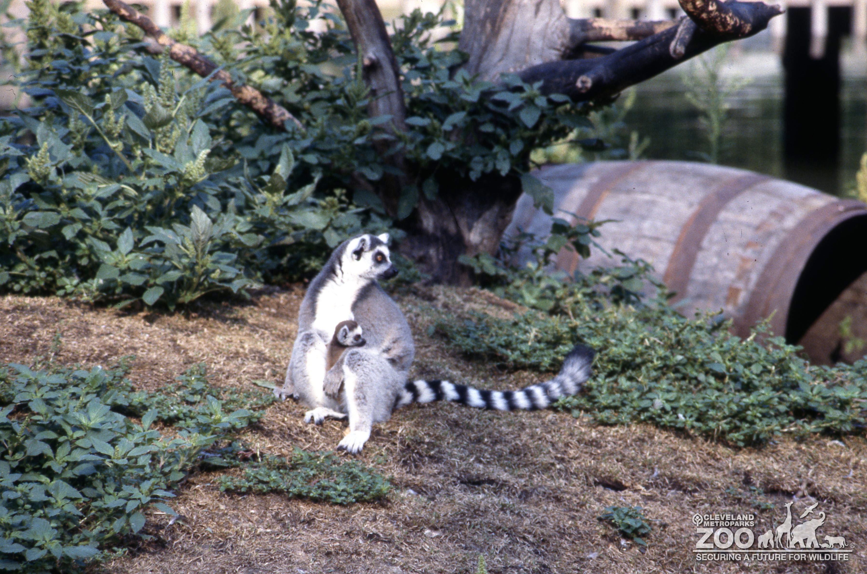 Ring-tailed lemur mother holding baby. View is from a distance and they are in an outdoor exhibit space. A wooden barrel is on its side next to a large tree. Perhaps the primates use it for shelter.