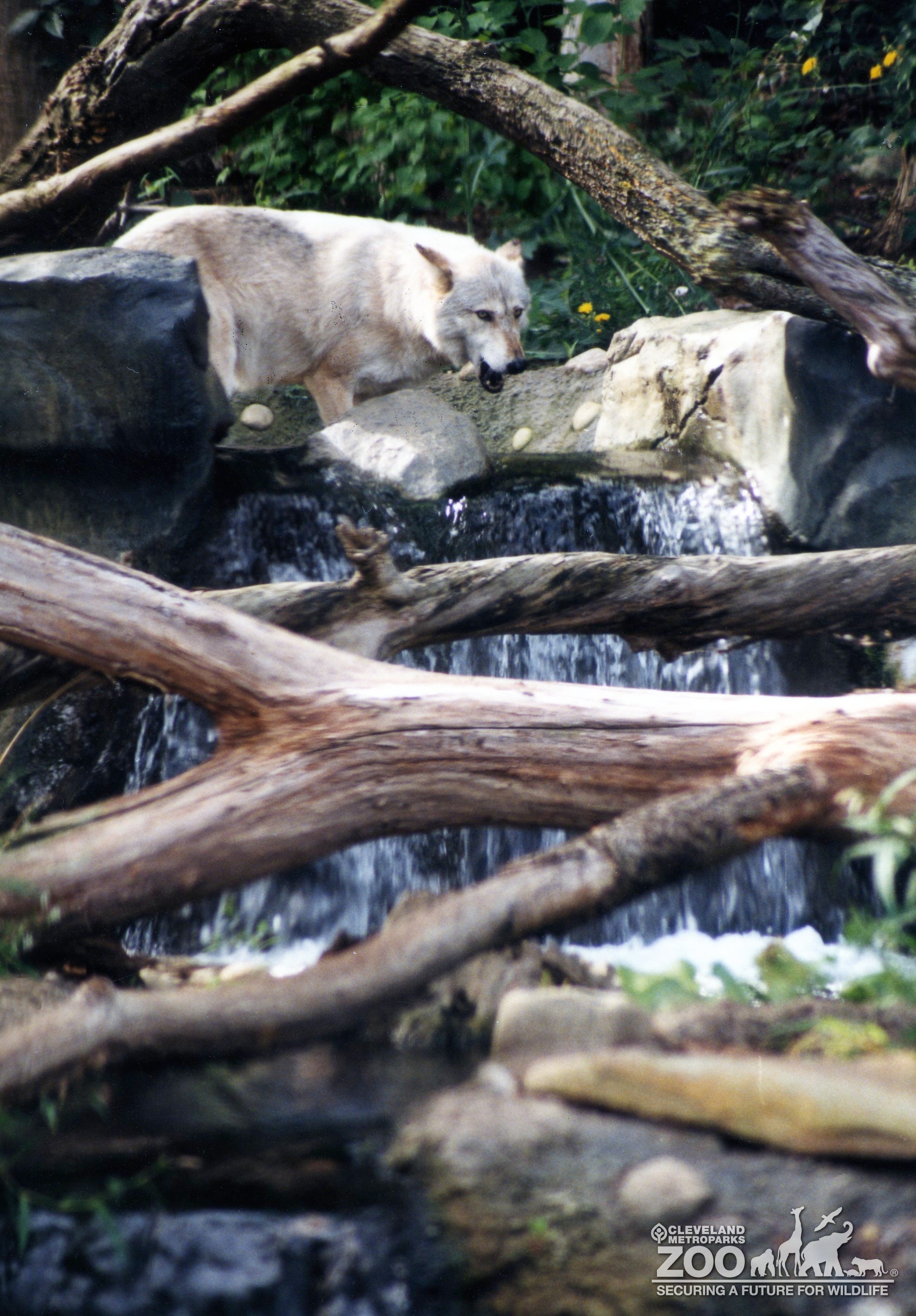 Photo shows a Mexican Gray Wolf crossing over waterfalls.