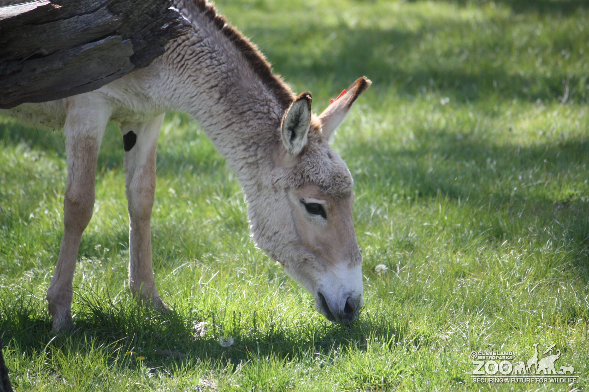Persian onager grazing in a field. This animal looks like a horse but has larger ears like a donkey. It is part of the equine family. It fur is dusty tan.