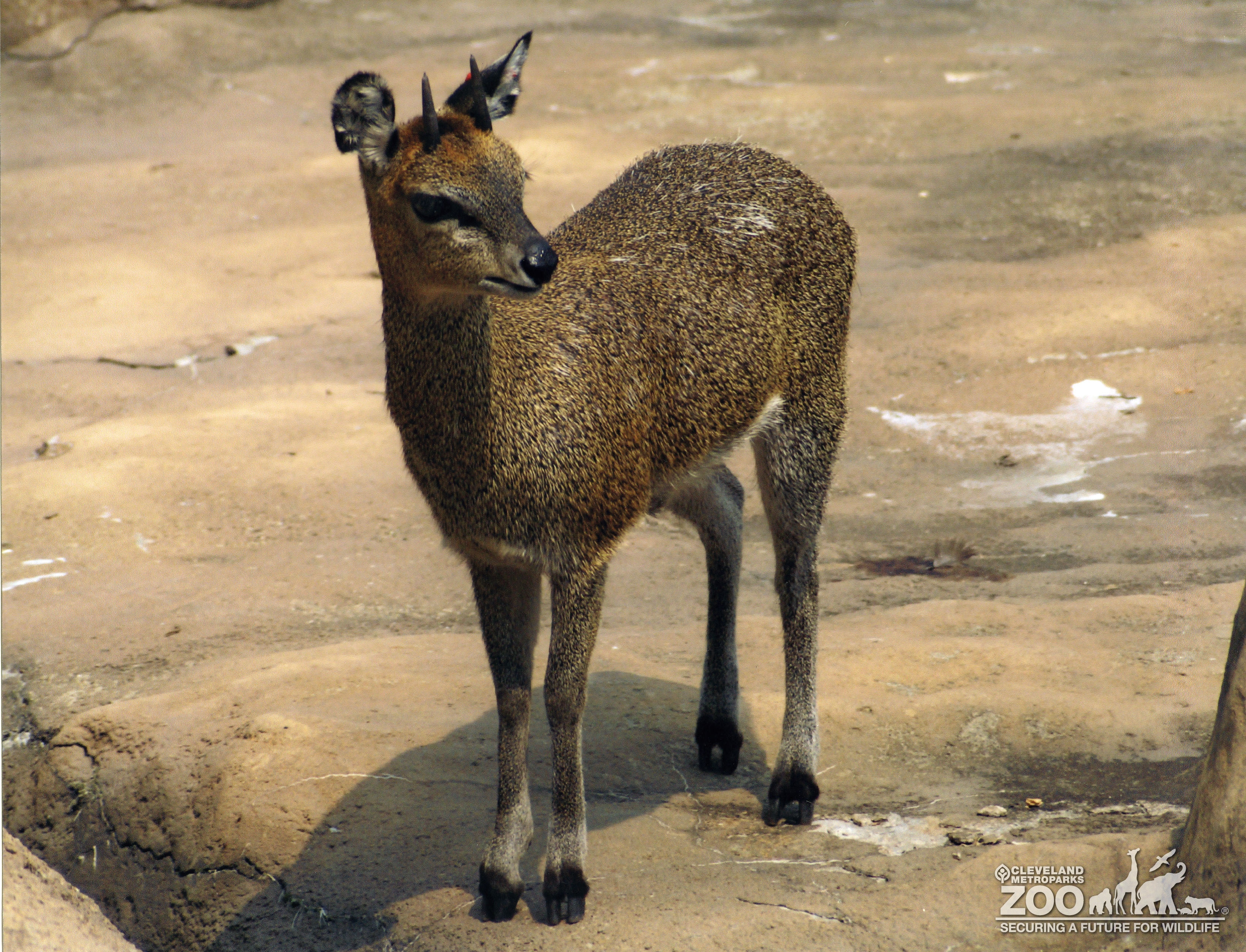 Klipspringer standing on monkey island. This small deer-like animal has hooves that help it climb steep terrain.