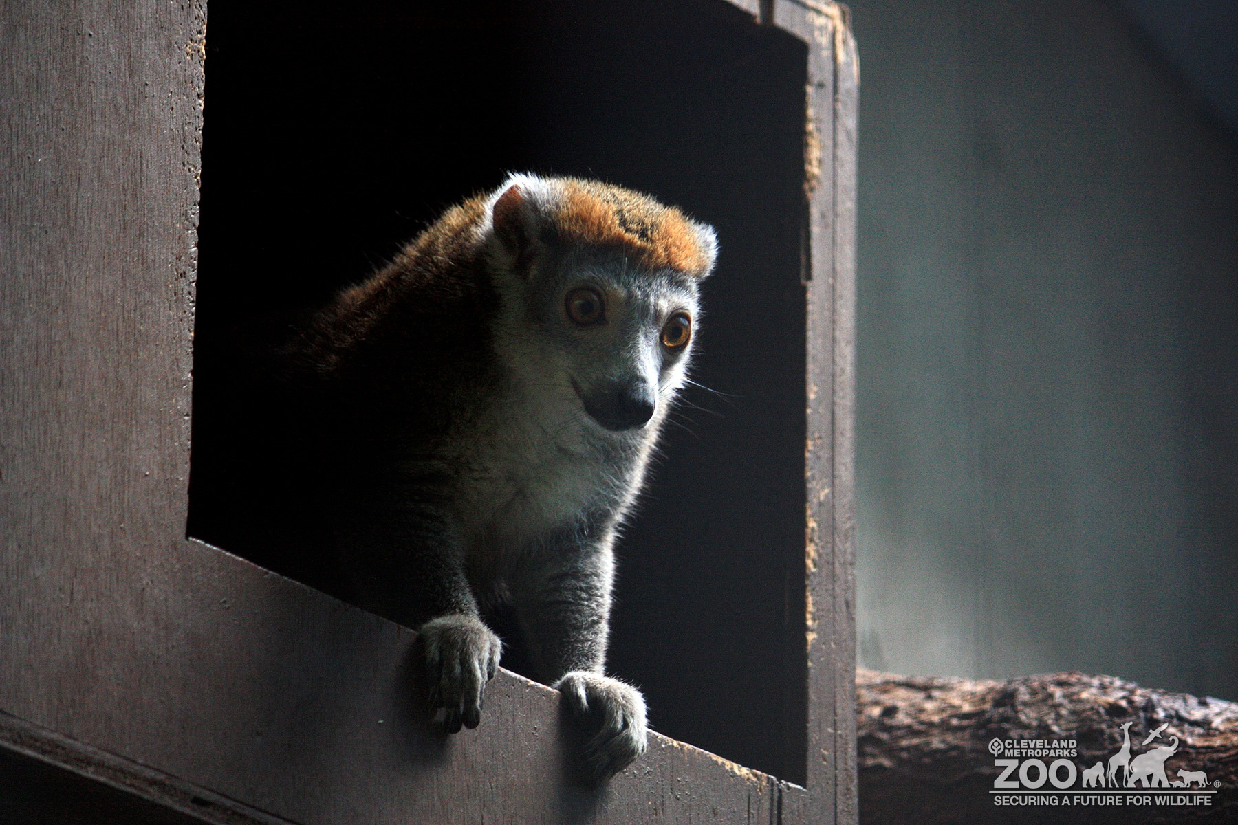 Crowned lemur looking out of it nest box. It is perched on the edge of the gray box which is elevated in its habitat.