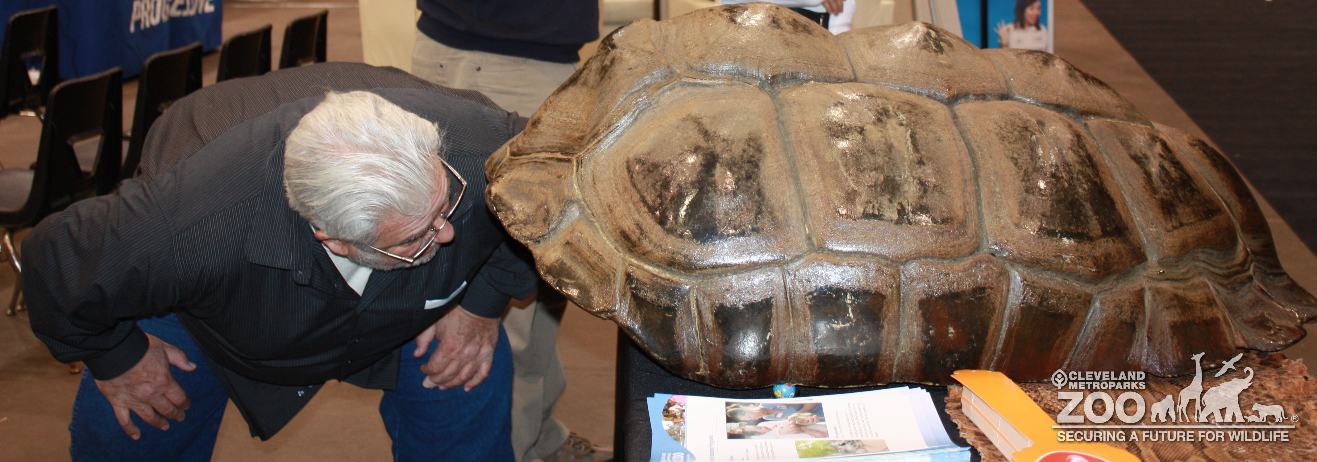 Visitor at 2014 RV Show looking at Tortoise Shell Bio Fact