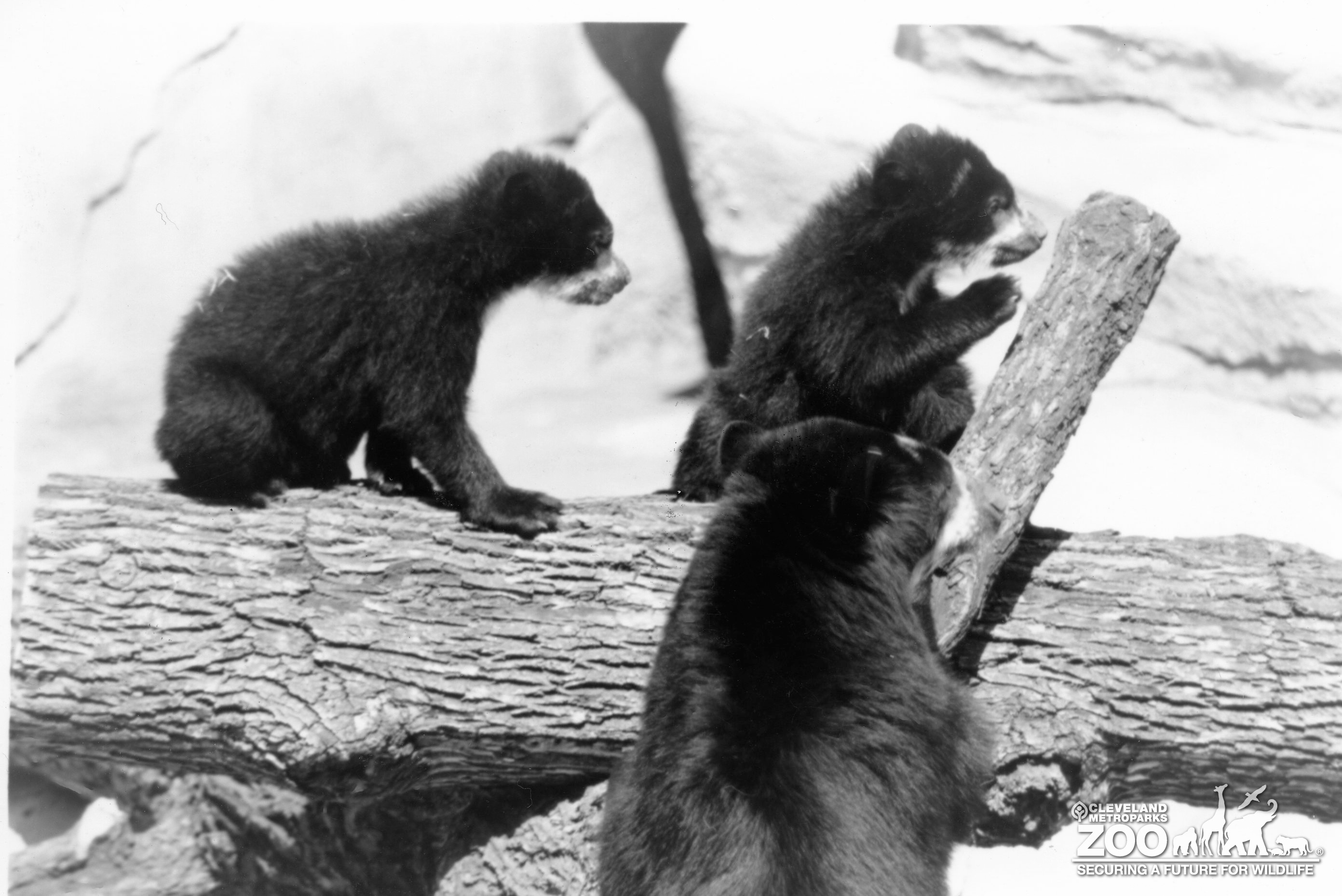 This is a black and white photo of an adult Andean (Spectacled) Bear and two cubs climbing on a pair of large logs sitting on top of each other in their enclosure. The cubs are sitting on the upper log about a foot apart both facing to the left while the adult bear is hanging on to the lower log with it's back to the camera. The cub closest to the adult bear has it's right front raised toward the vertical branch the adult bear is hanging on to. Both bears are covered in black fur with brown fur on their muzzles as well as some flecks around their eyes giving the appearance that their are wearing spectacles.