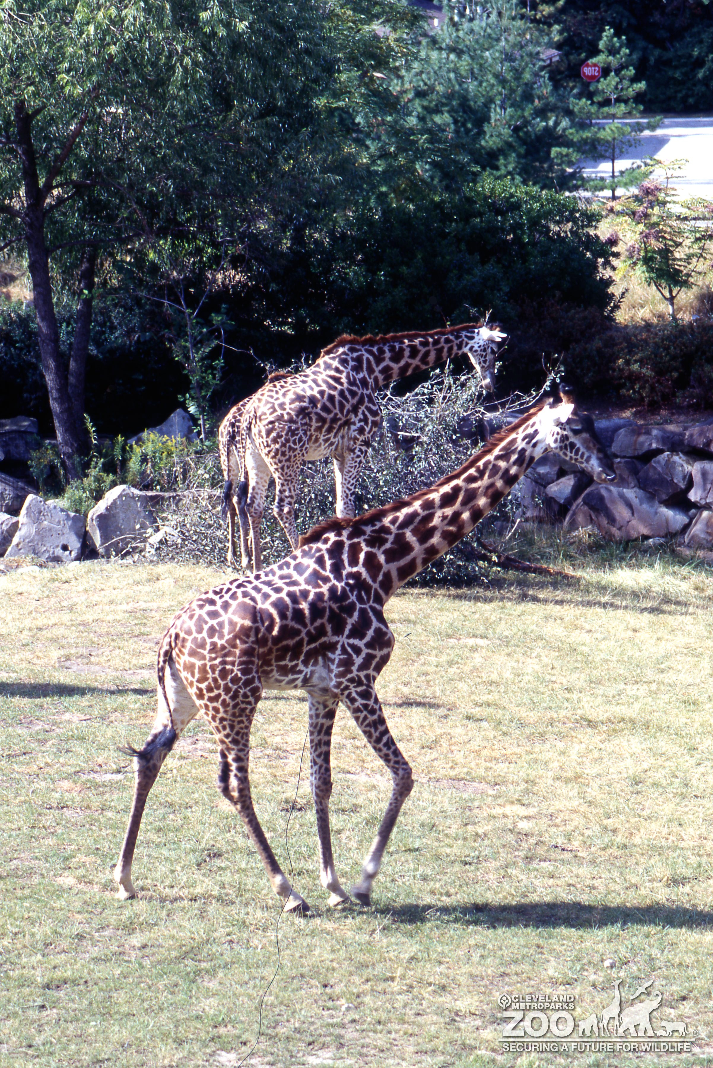 Pair of Masai giraffe in African savanna yard. One is eating browse on the ground and the other is walking. Trees and low rock wall is in background.