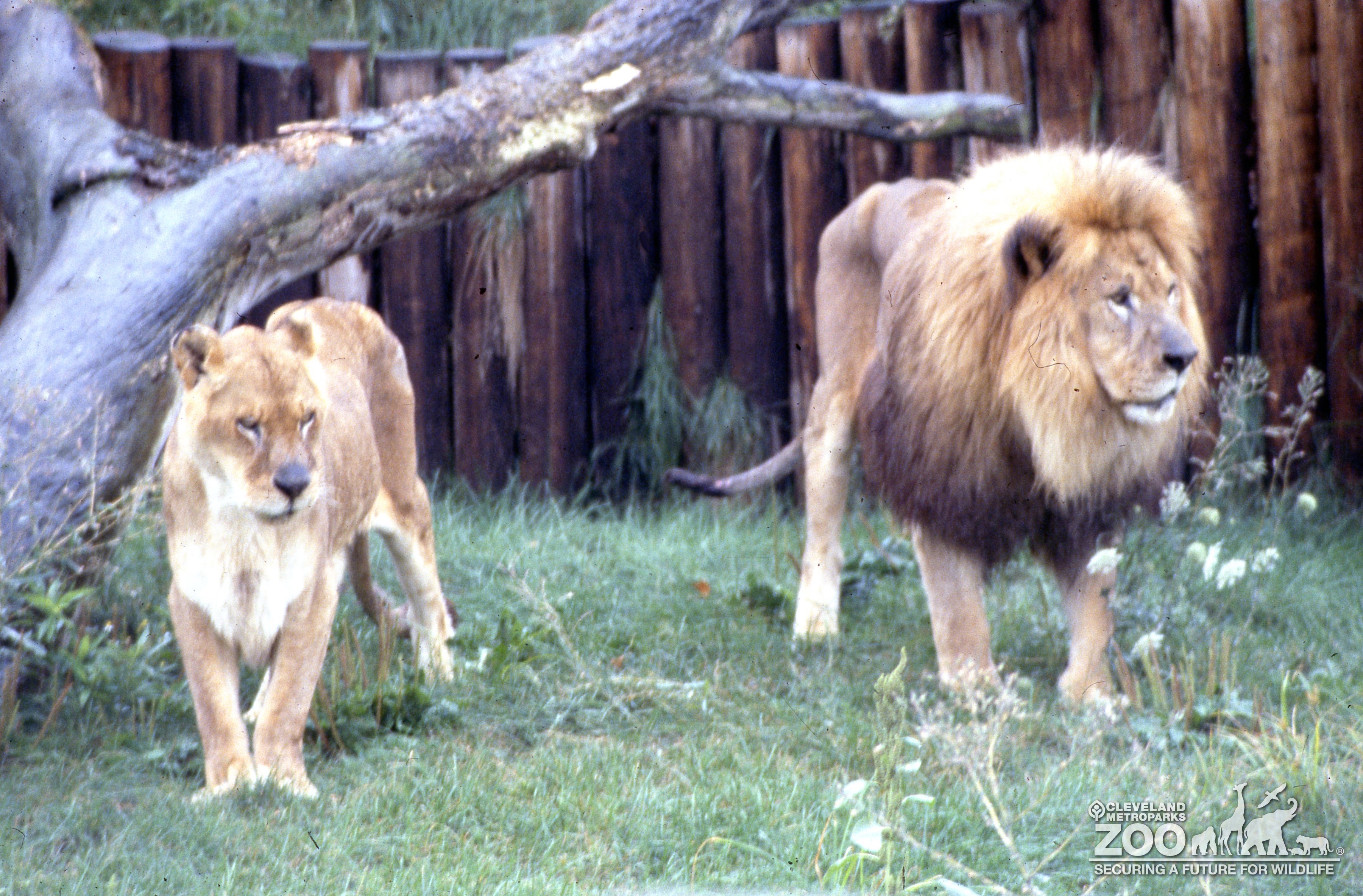 Male and female lion walking together in the grassy area of outdoor exhibit. Wooden timber barrier is in the background.
