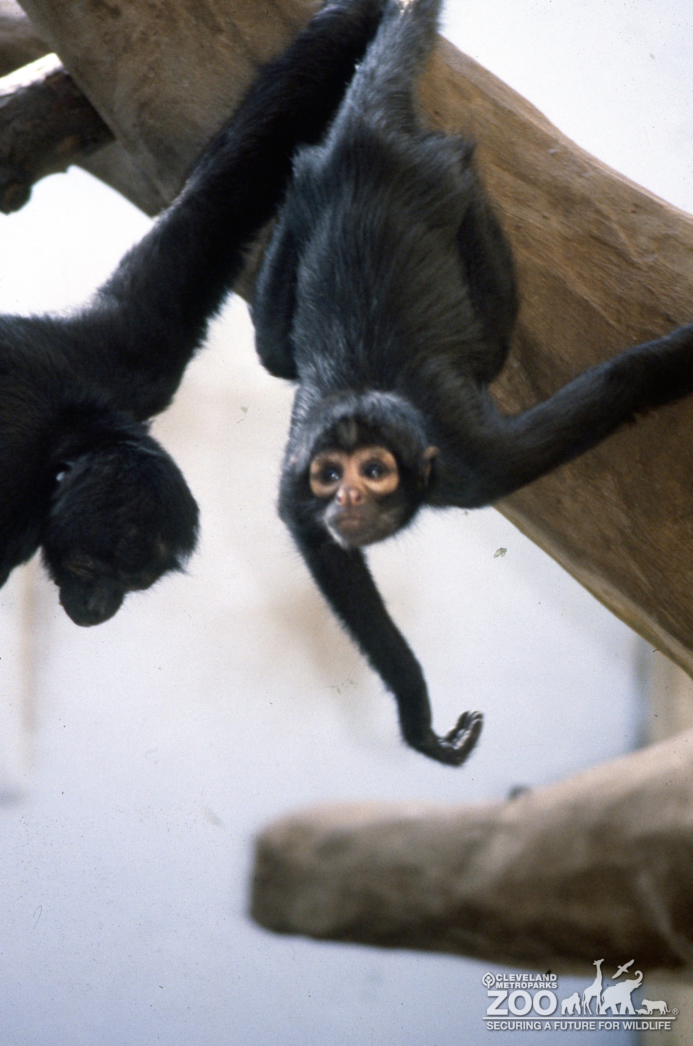 Robust black spider monkeys hanging out upside down. Image is slightly out of focus. One monkey is looking at the camera.