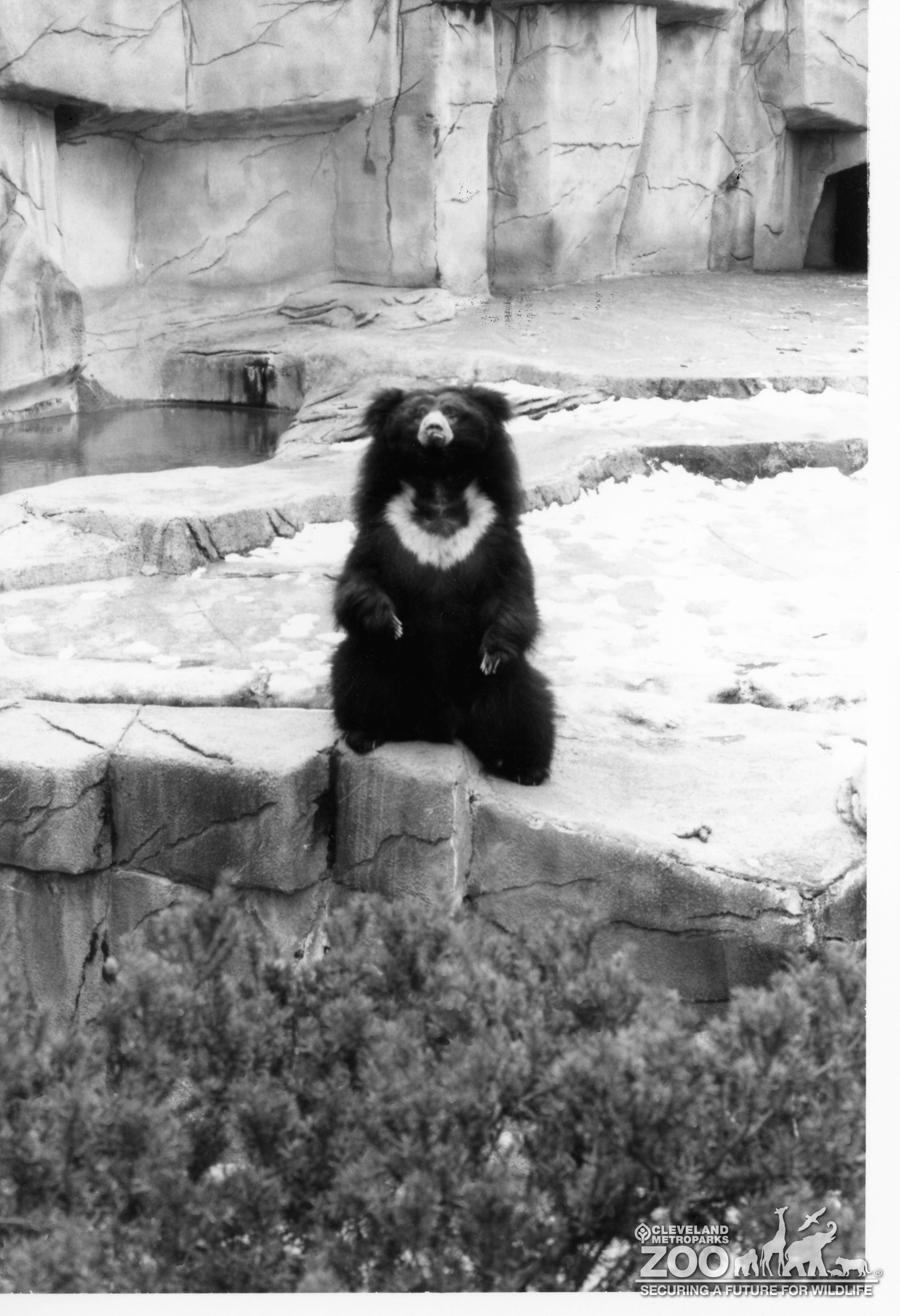 This is a black and white photo of a Sloth Bear sitting up on it hind legs looking towards the camera. The bear is sitting on the cliff edge of the trench in its outdoor enclosure. The bear is covered in long black fur with light brown fur on its muzzle and a single curved stripe across its chest.